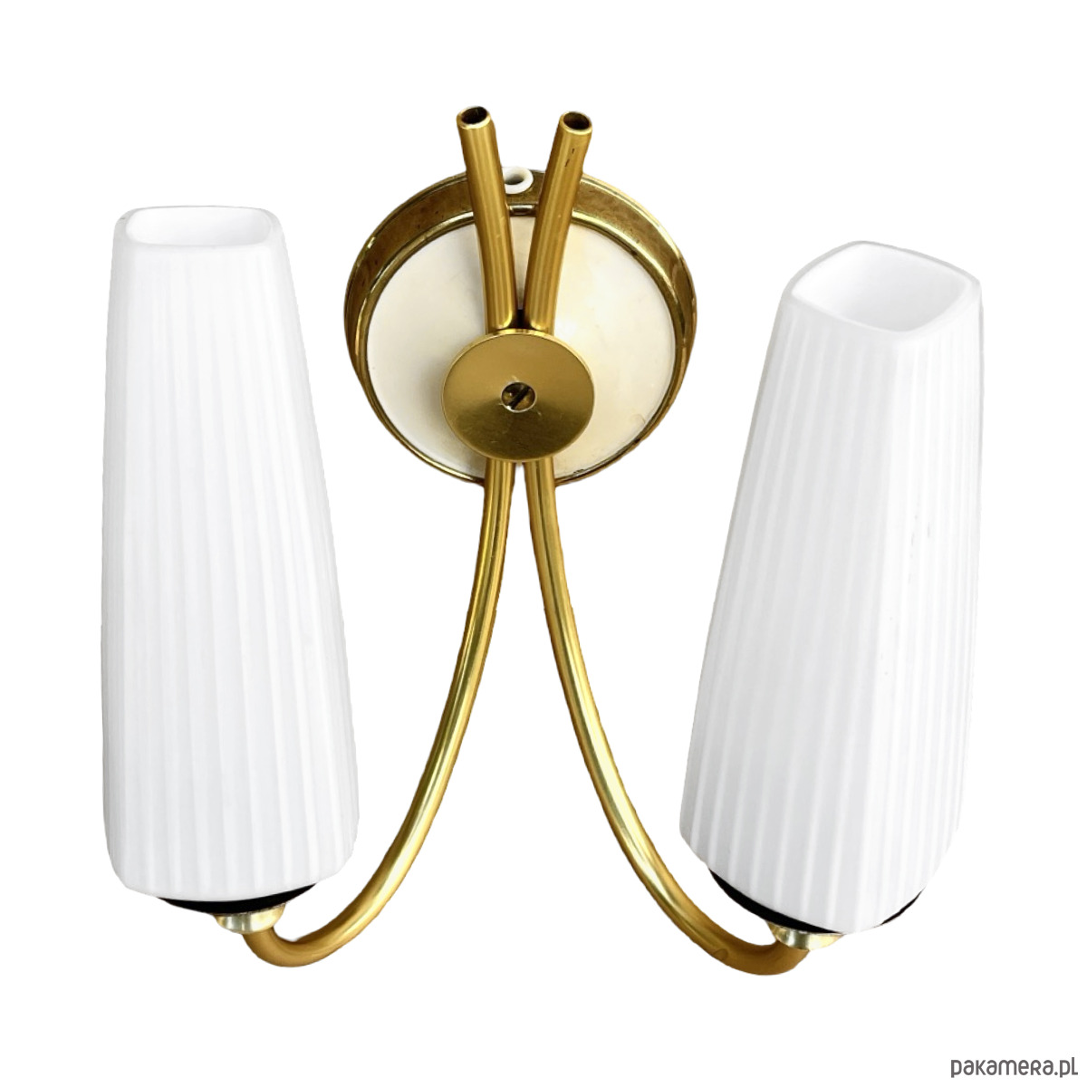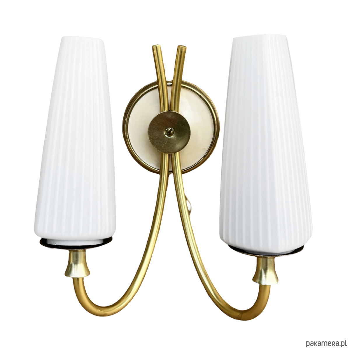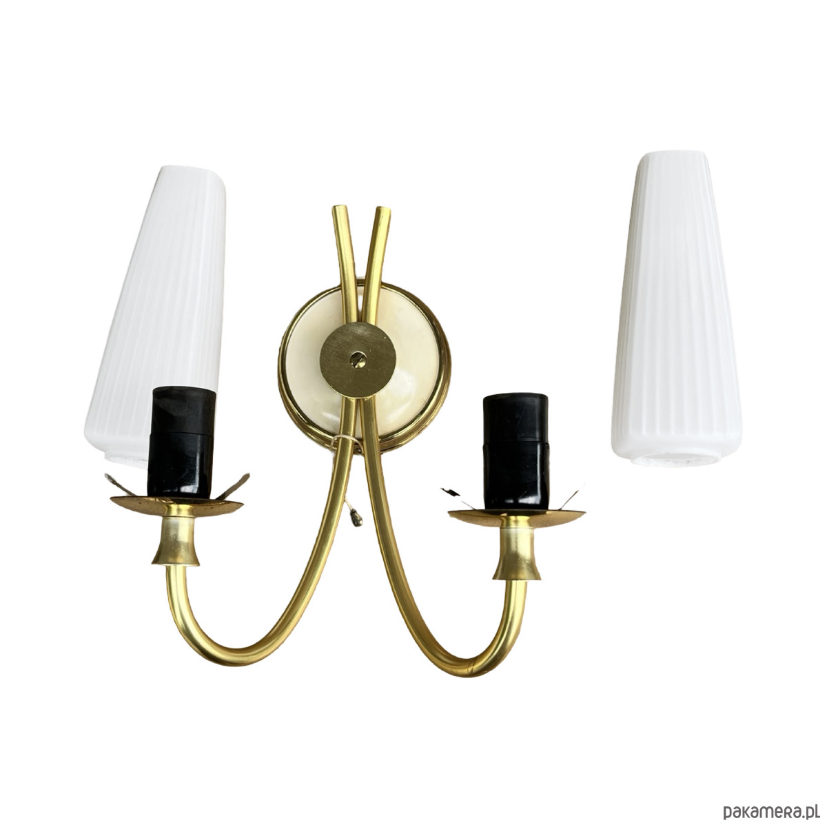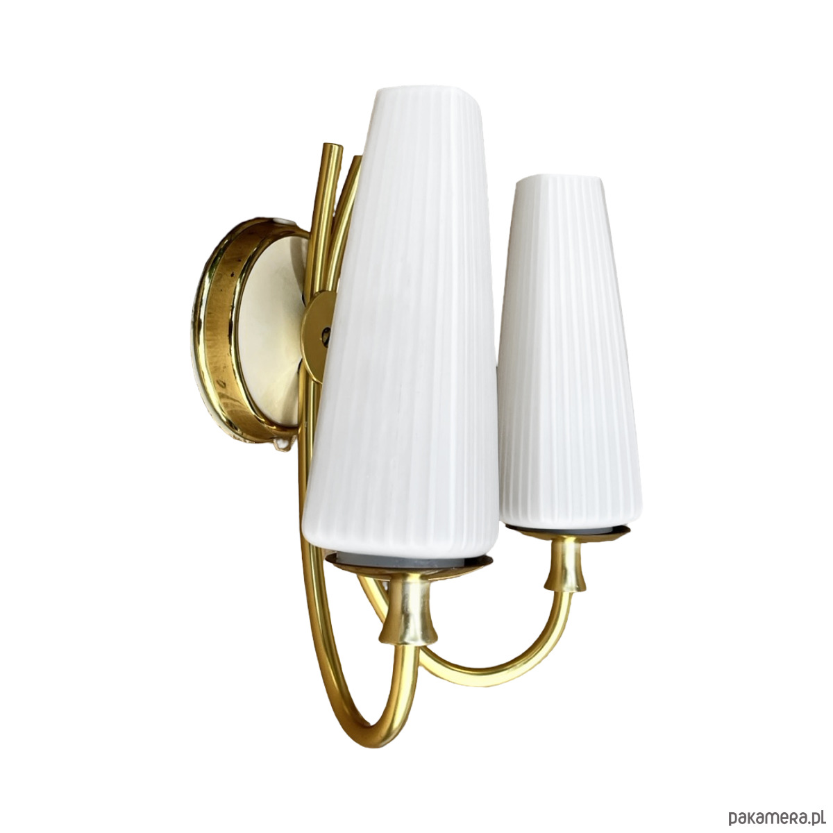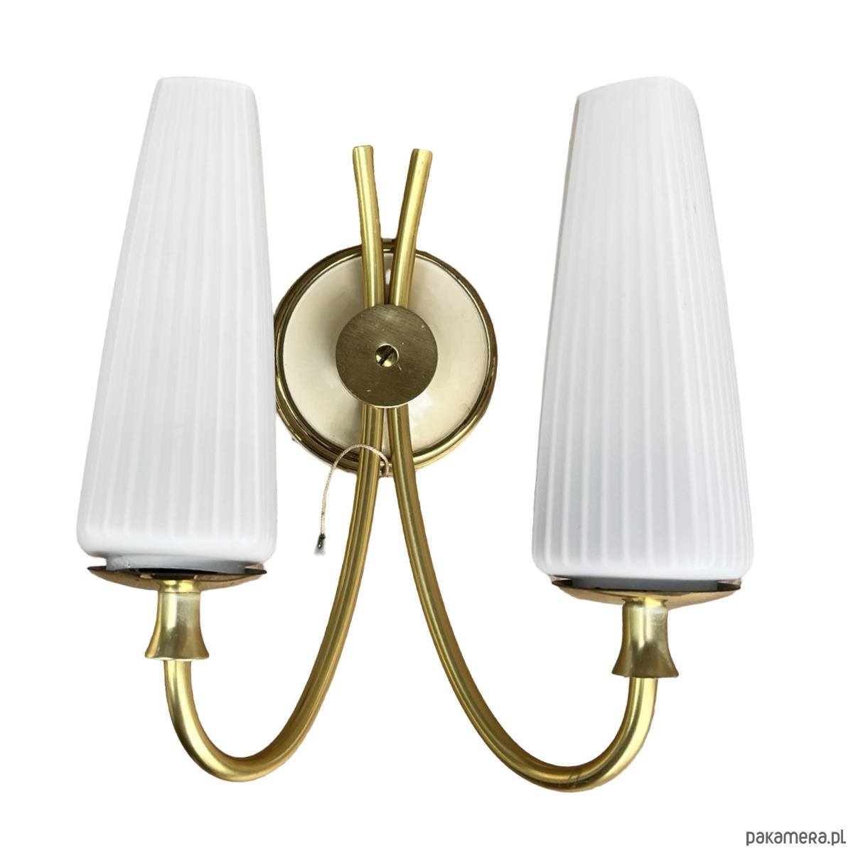 Podwójny kinkiet w stylu Hollywood Regency wyprodukowany w niemczech na przełomie lat 50. i 60. XX wieku. Lampka w stanie idealnym, nie nosi śladów użytkowania.Wyszukana forma kinkietów sprawdzi się w nowoczesnym pomieszczeniu. Instalacje elektryczne są sprawne, do lamp pasują żarówki na gwint E27. Sprzedawane bez żarówek. Klosz ze szkła dwuwarstwowego, o symetrycznej strukturze, osadzony na mosiężnym ramieniu, lampka na pojedynczą żarówkę E27 do 60W.