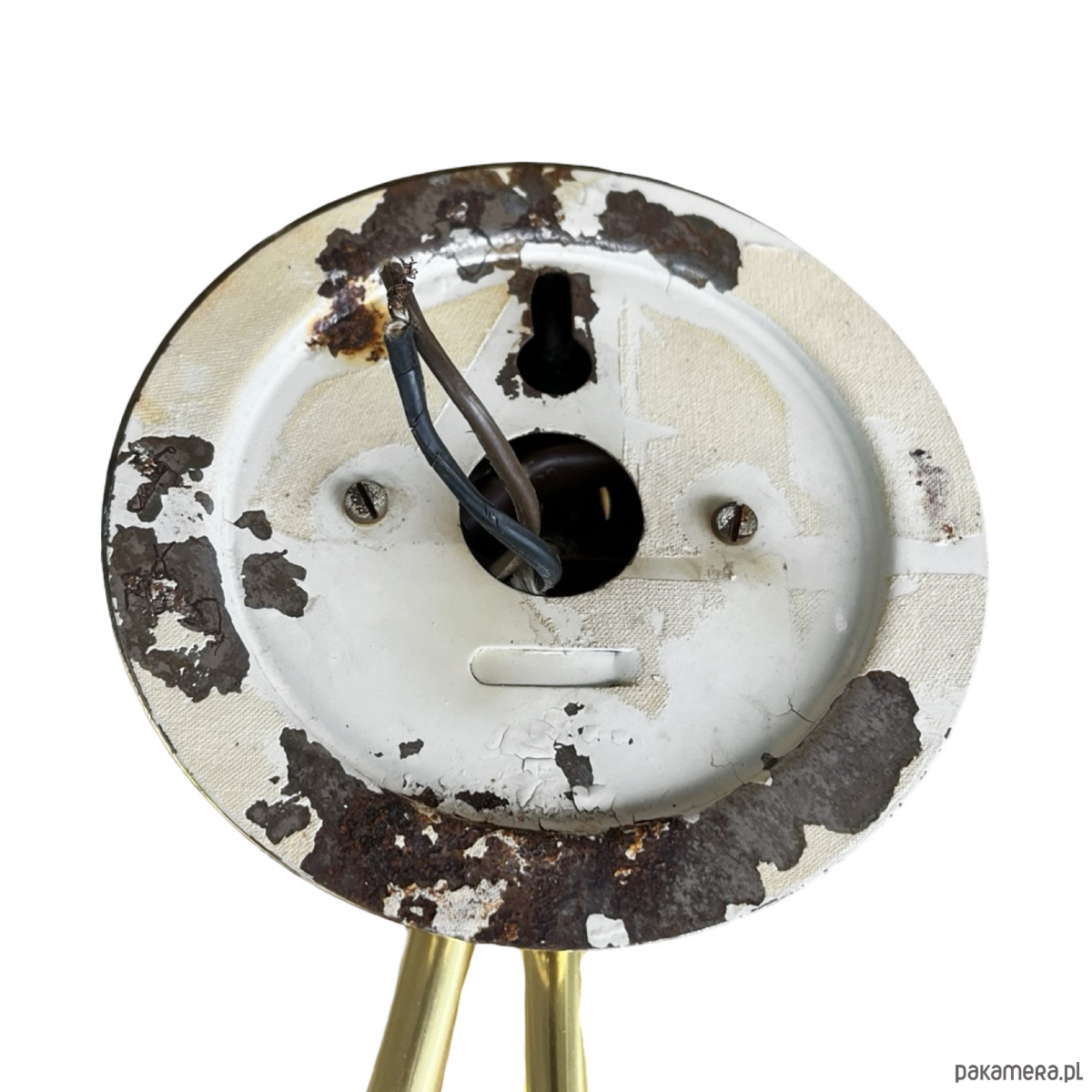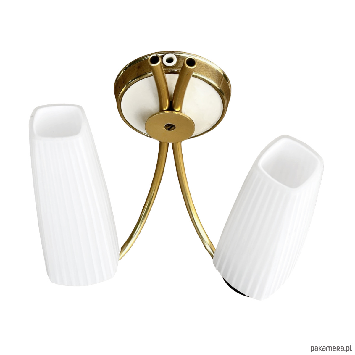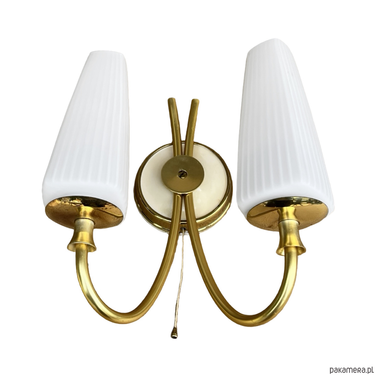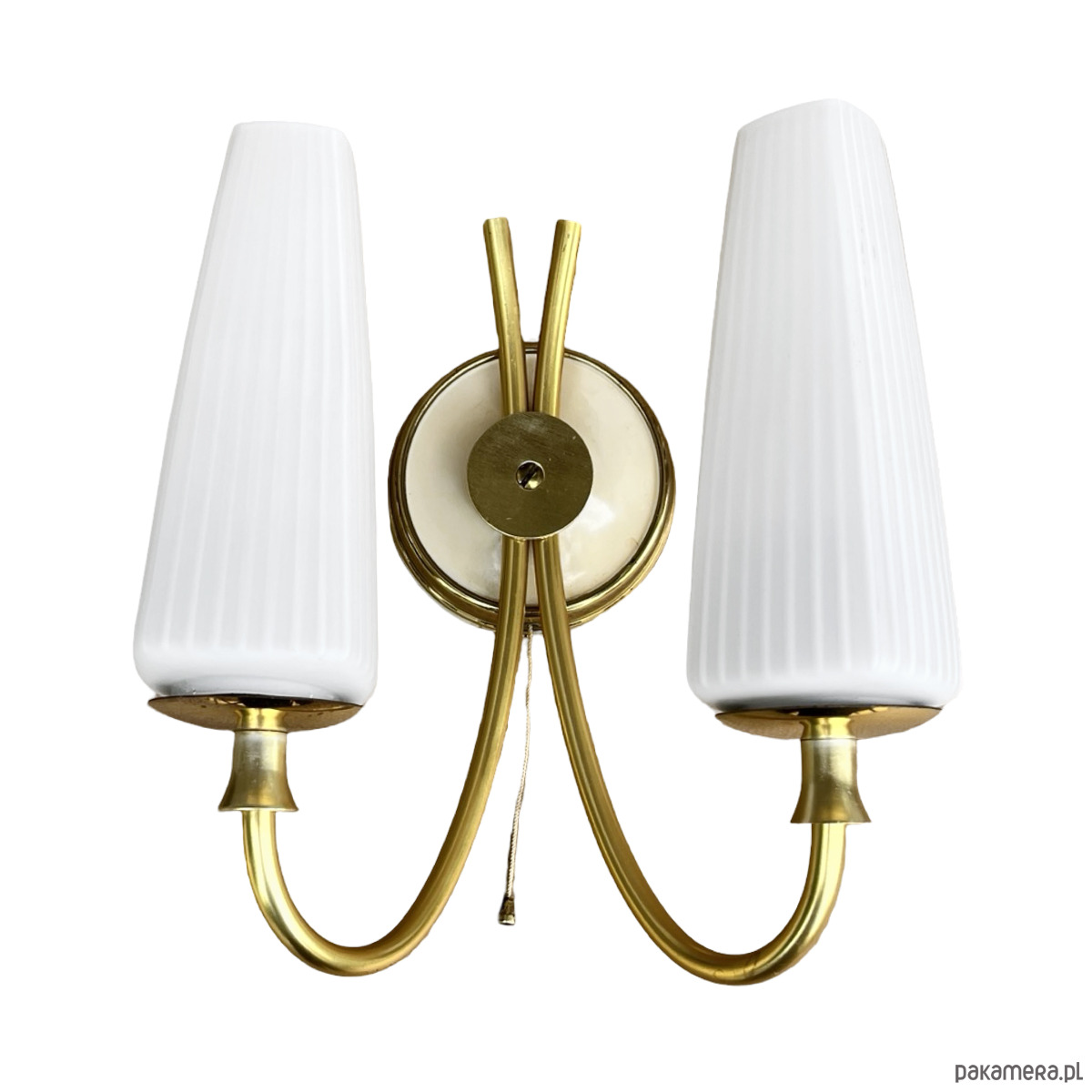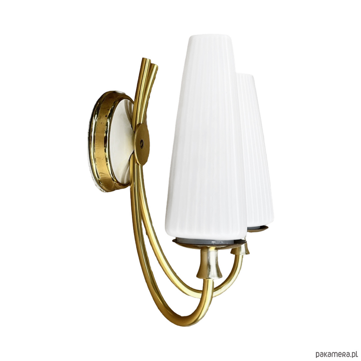 Podwójny kinkiet w stylu Hollywood Regency wyprodukowany w niemczech na przełomie lat 50. i 60. XX wieku. Lampka w stanie idealnym, nie nosi śladów użytkowania.Wyszukana forma kinkietów sprawdzi się w nowoczesnym pomieszczeniu. Instalacje elektryczne są sprawne, do lamp pasują żarówki na gwint E27. Sprzedawane bez żarówek. Klosz ze szkła dwuwarstwowego, o symetrycznej strukturze, osadzony na mosiężnym ramieniu, lampka na pojedynczą żarówkę E27 do 60W.