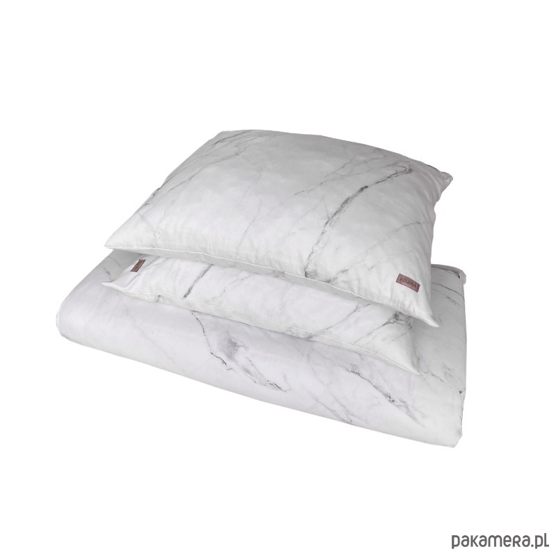 Zestaw pościeli z dwiema poszewkami z kolekcji White Marble. Wzór naturalnego białego marmuru z szarymi użyłowaniami. Poszwa na kołdrę oraz poszewki na poduszki mają wszyty wysokiej jakości zamek błyskawiczny. Komplet zapakowany jest w ozdobny worek w taki sam nadruk.