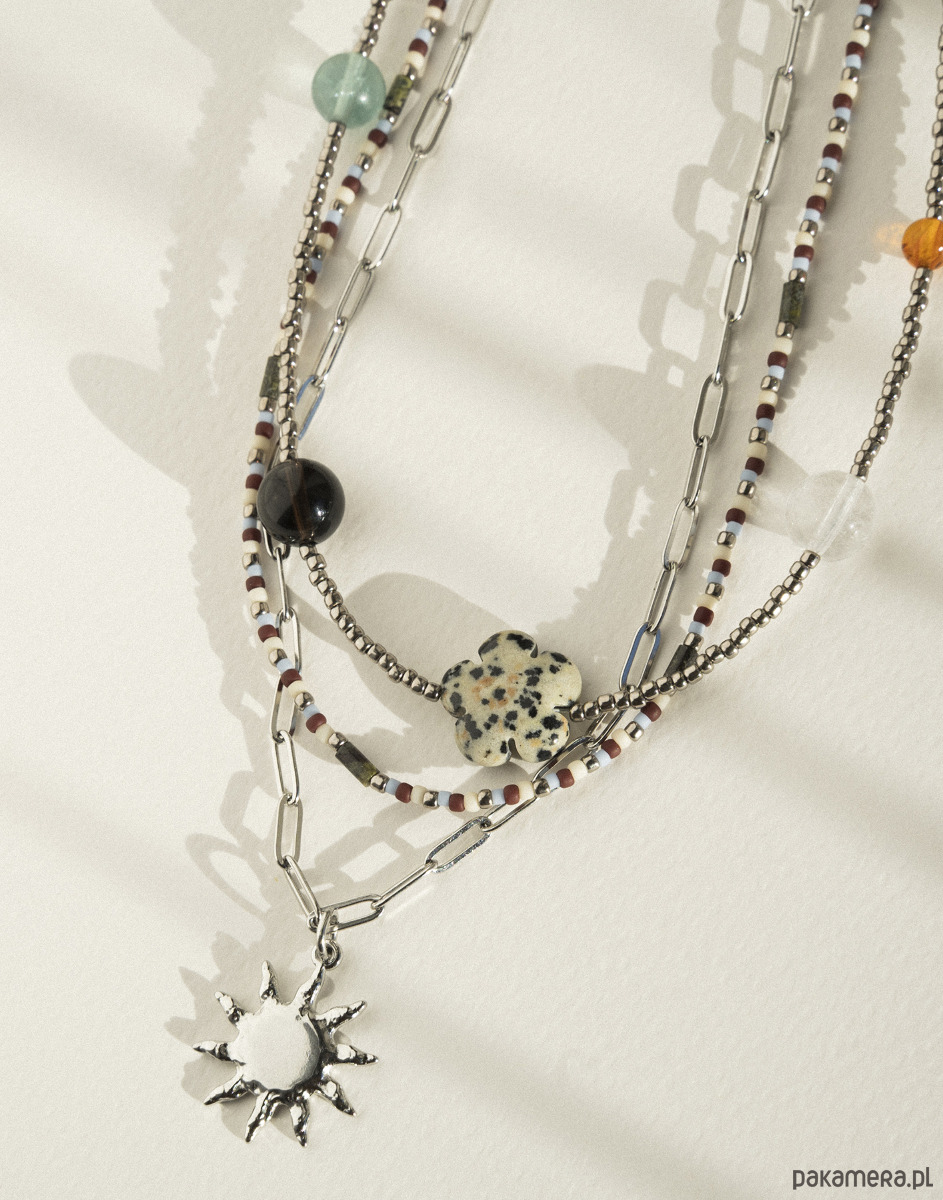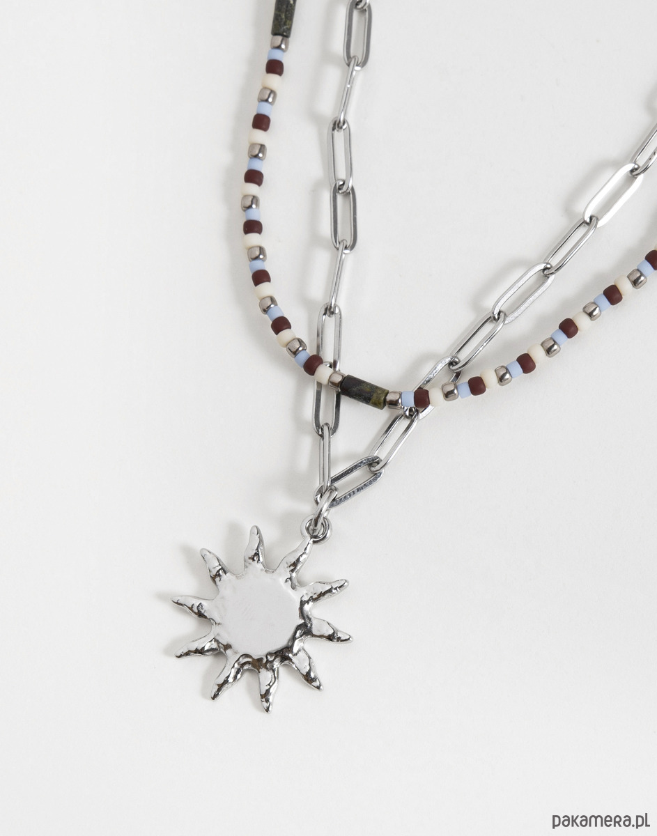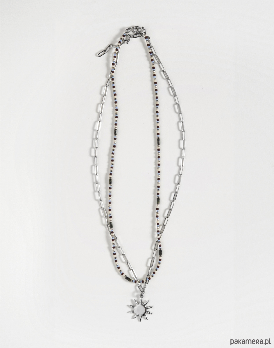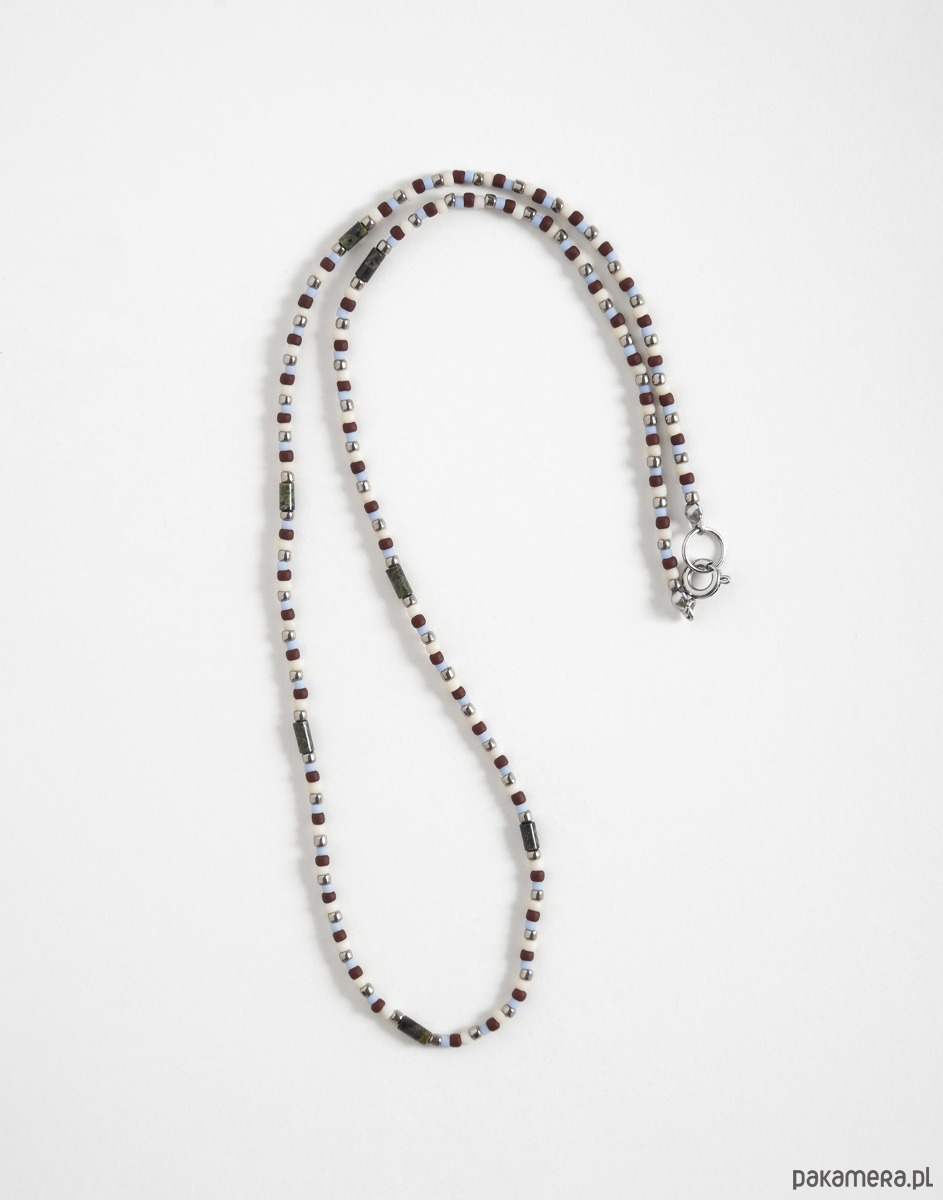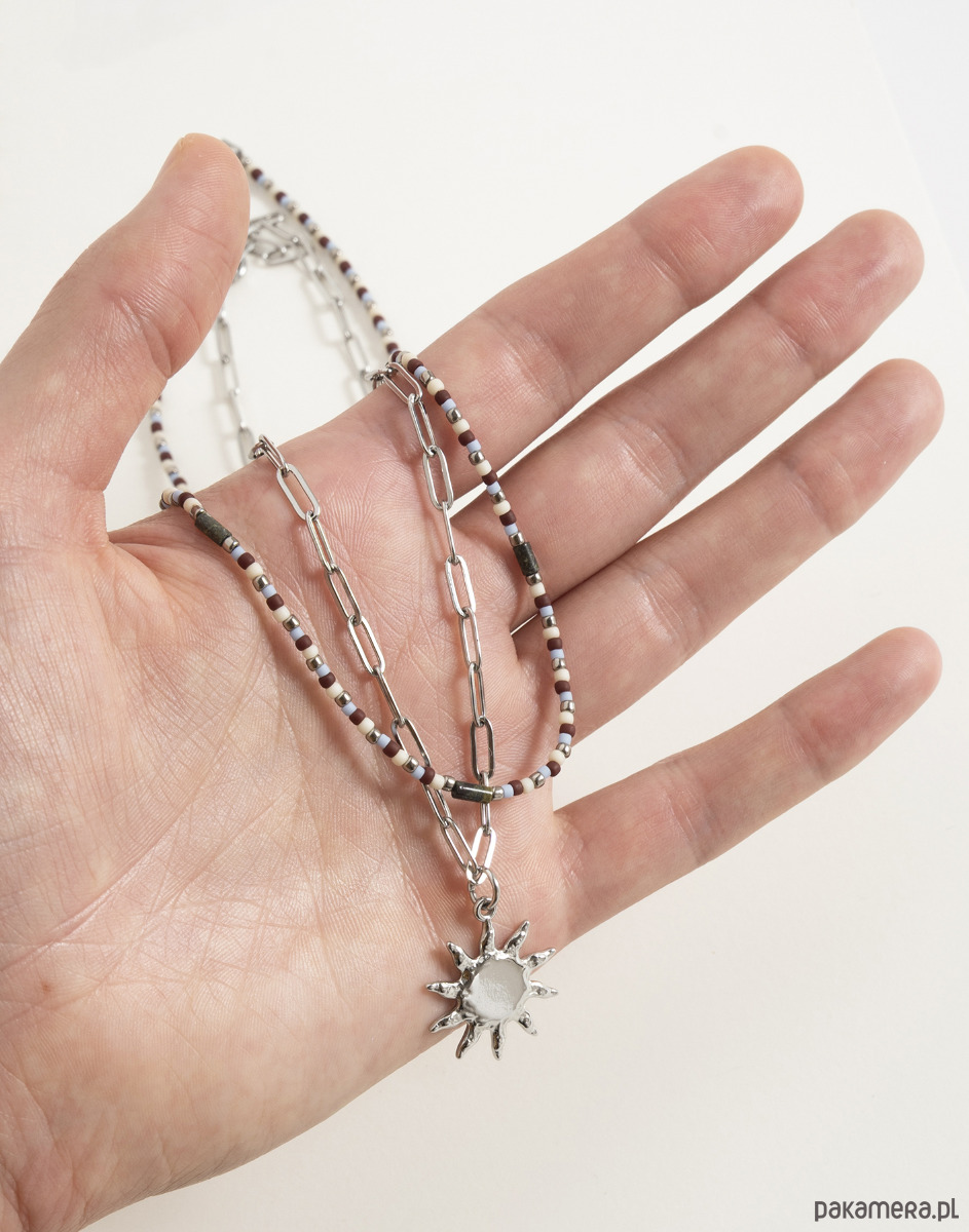 Podwójny naszyjnik składa się z dwóch części – klasycznego łańcuszka ze stali chirurgicznej z zawieszką w kształcie słońca oraz kompozycji koralików TOHO w odcieniach srebra, brązu i jasnego błękitu, połączonych z kamieniami jaspisu smoczego. Naszyjniki można nosić razem lub osobno, tworząc różne zestawienia.