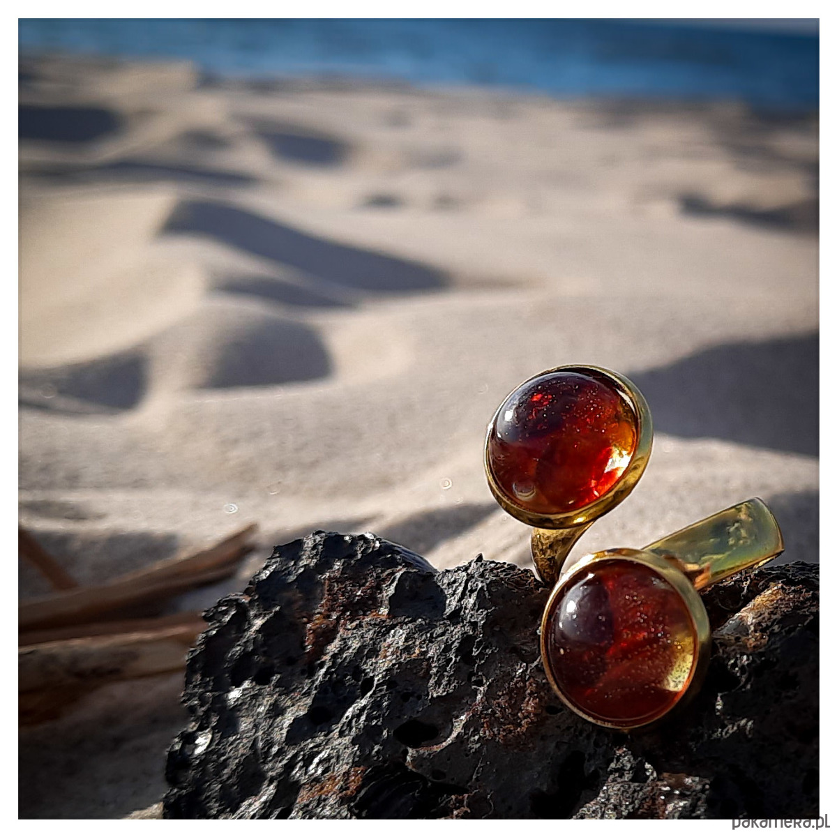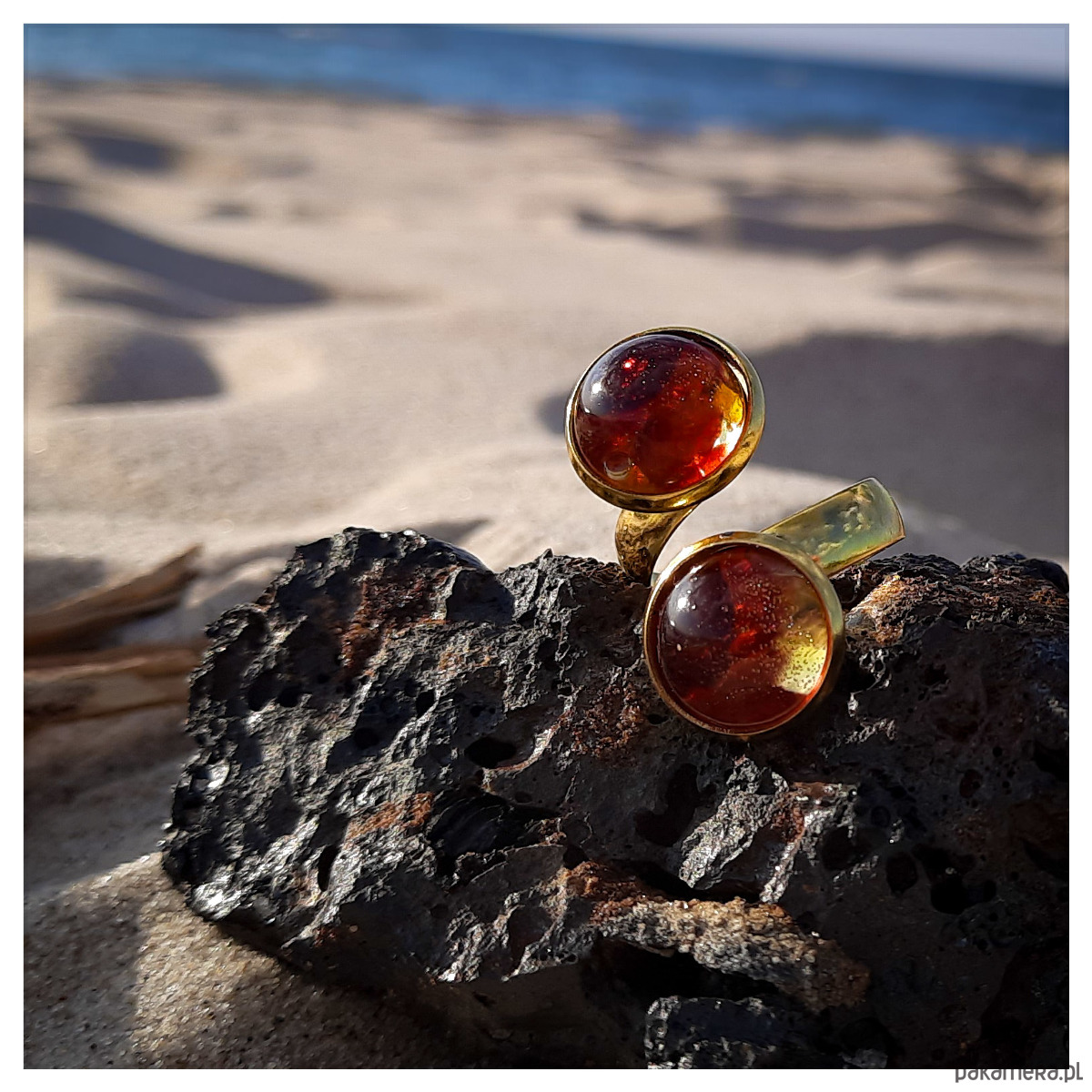 Pierścionek z podwójnym oczkiem z zatopionym w żywicy epoksydowej bursztynem.