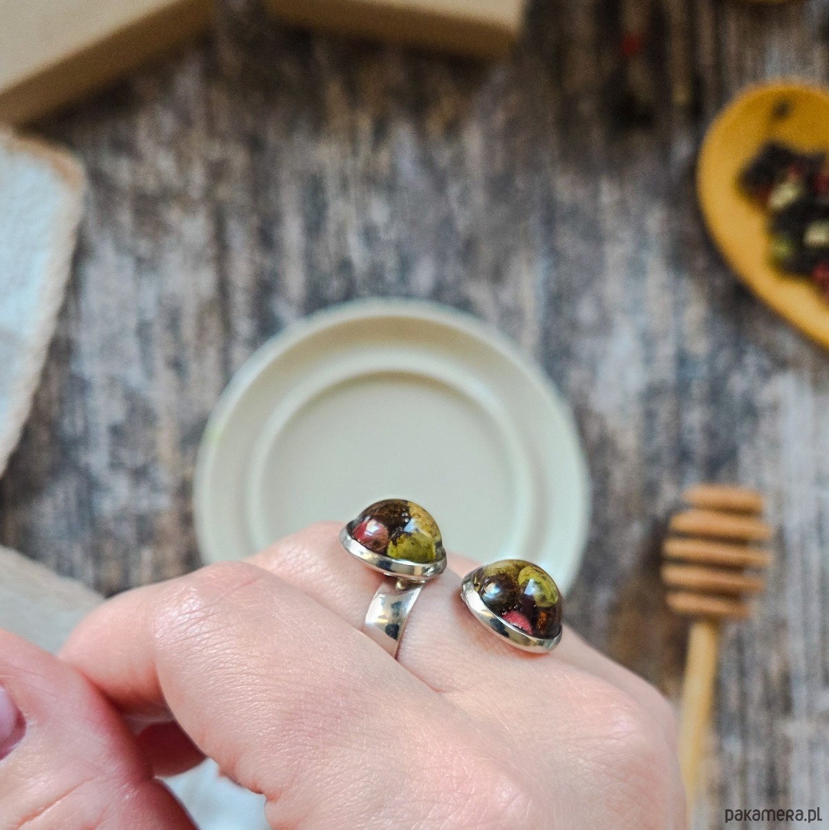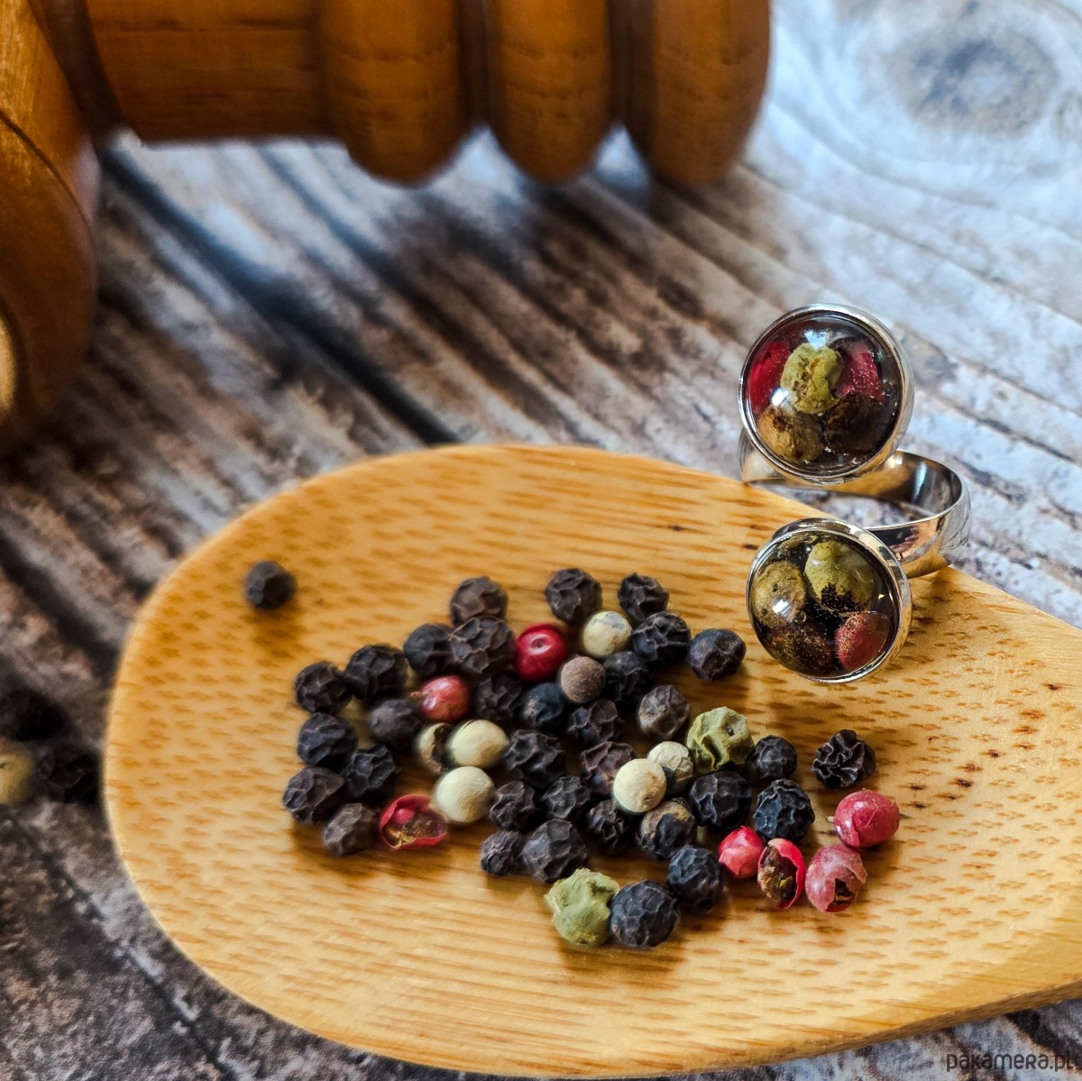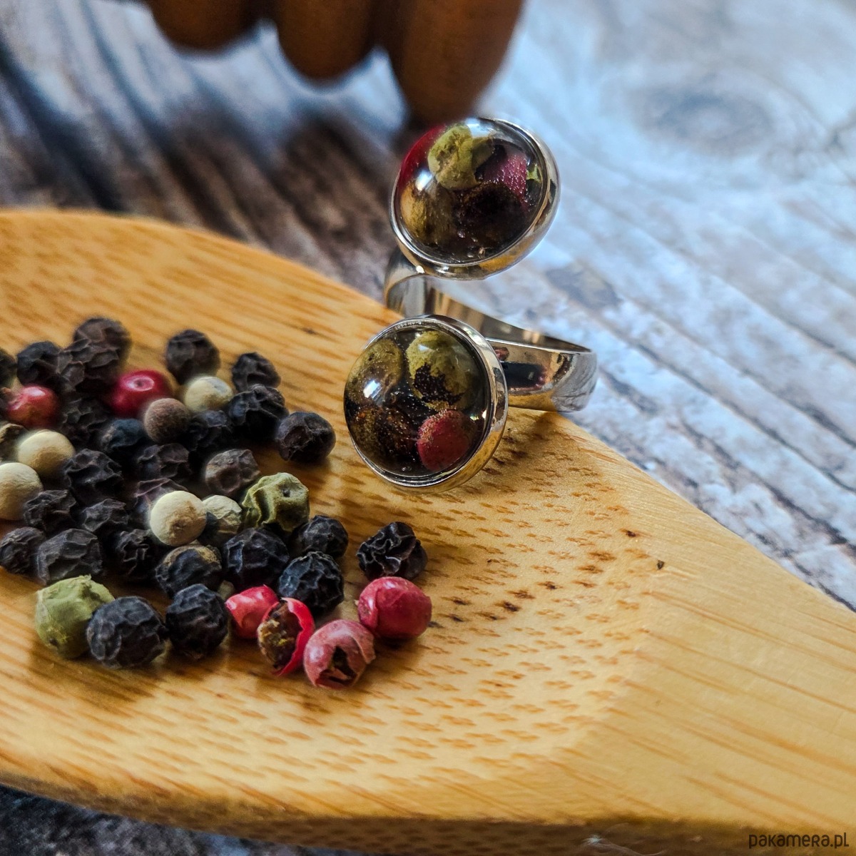 Pierścionek z podwójnym oczkiem z pieprzem zatopionym w żywicy epoksydowej.
