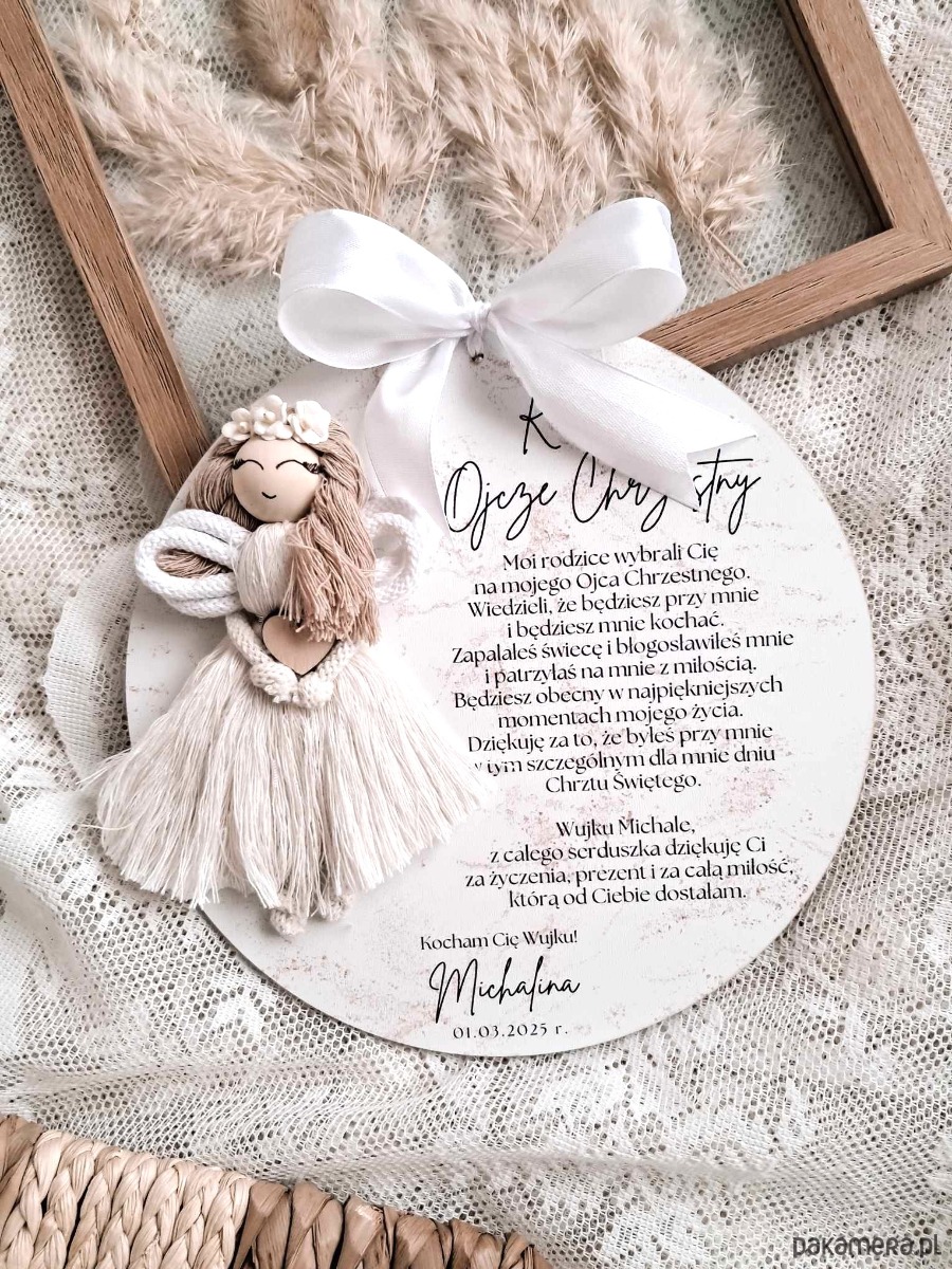 Wybór Ojca Chrzestnego to ważna decyzja, a dzień Chrztu Świętego jest doskonałą okazją, by wyrazić wdzięczność za przyjęcie tej roli. Nasze personalizowane podziękowanie z ręcznie robionym aniołem z makramy to elegancki i trwały sposób na podziękowanie Ojcu Chrzestnemu za jego obecność i wsparcie.