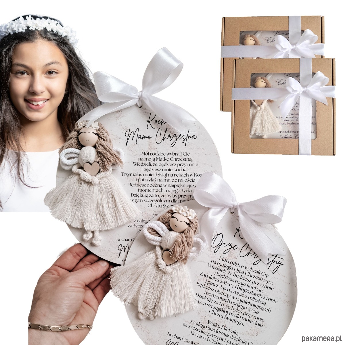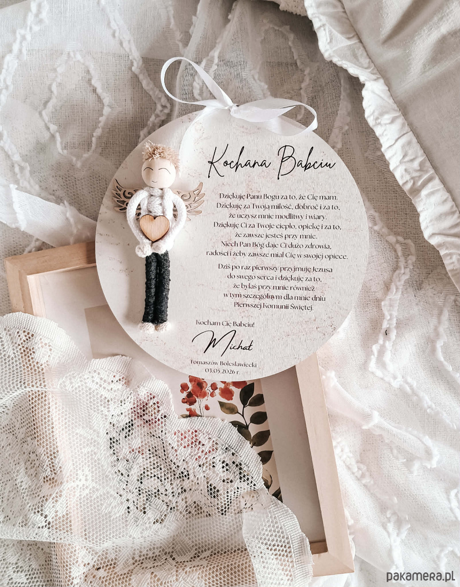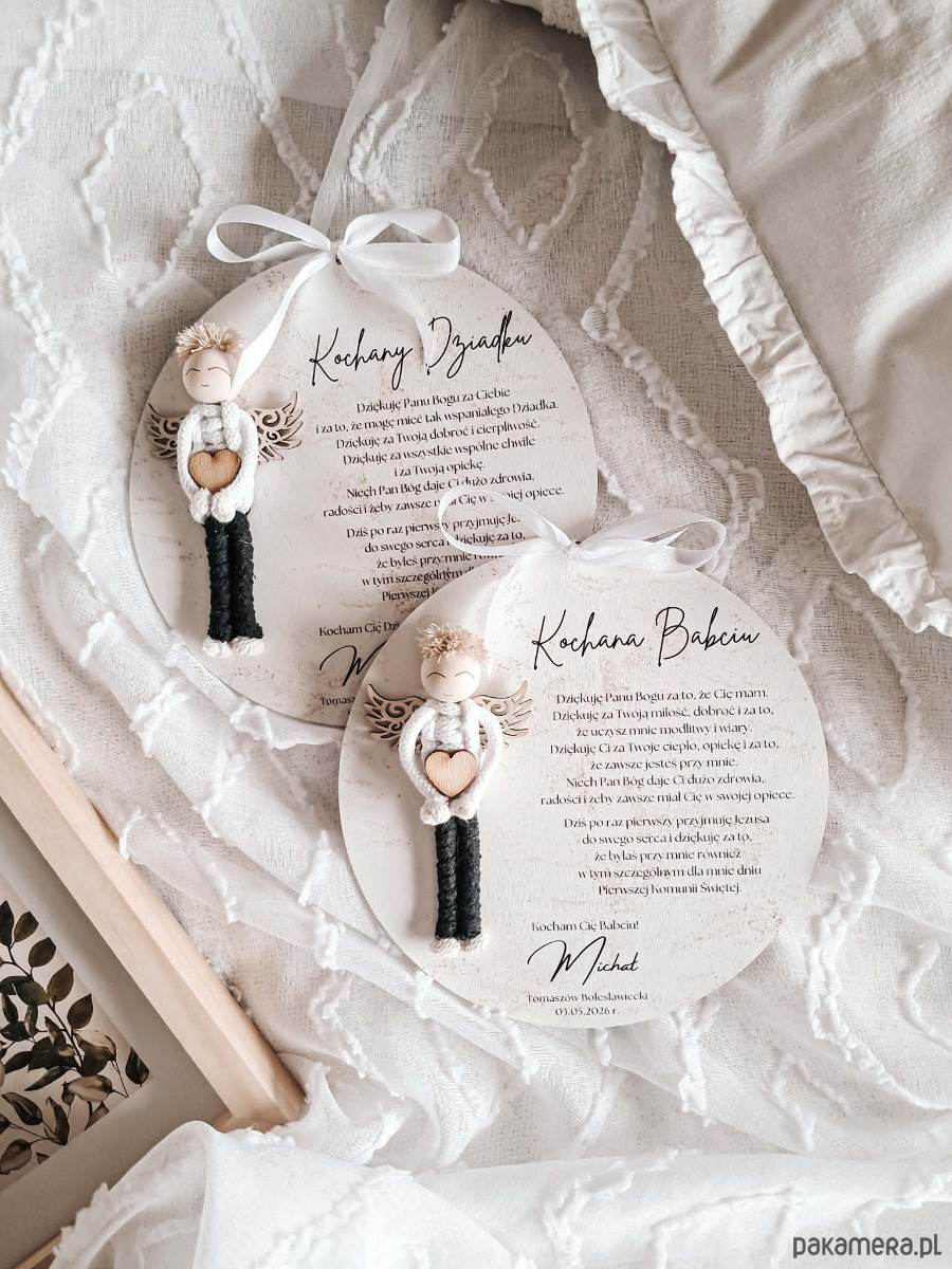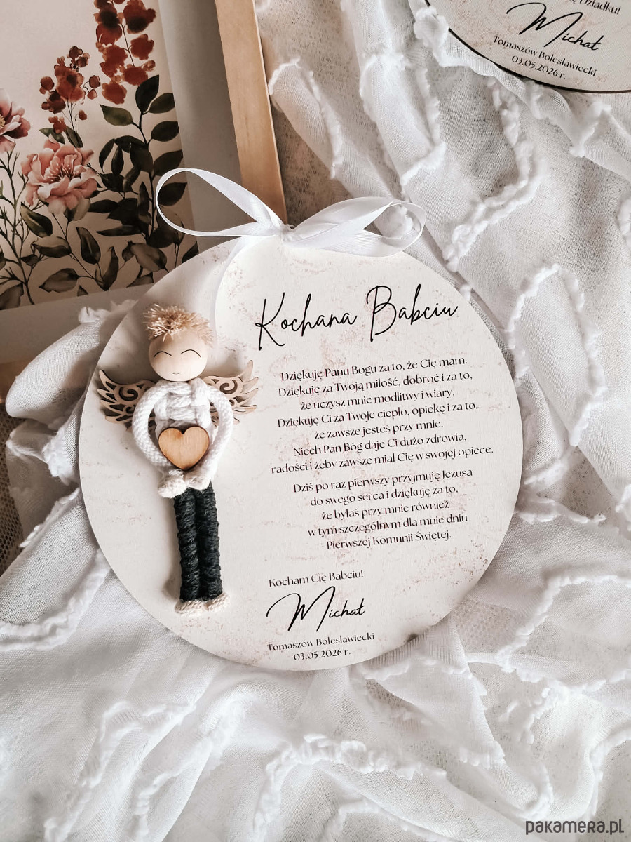 Każde podziękowanie wykonane jest na okrągłej tabliczce o średnicy 20 cm, ozdobionej ręcznie robionym aniołkiem, co nadaje całości unikalnego charakteru.