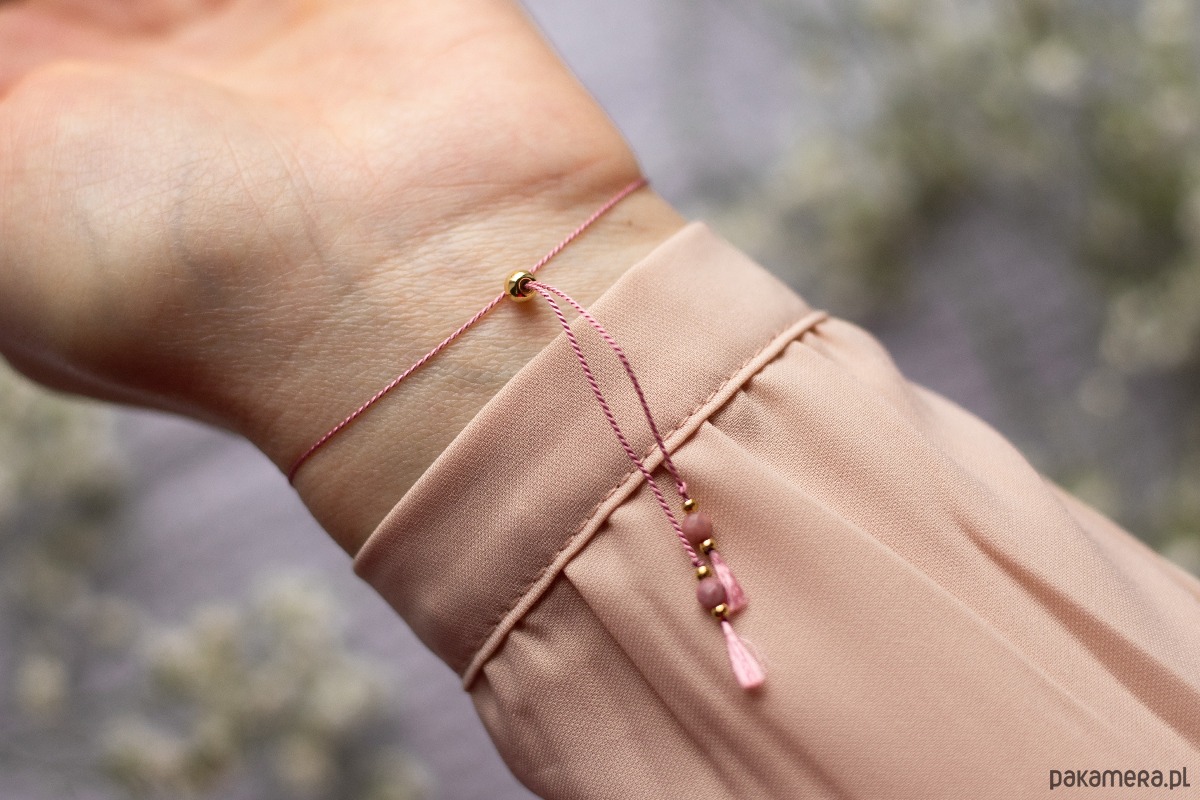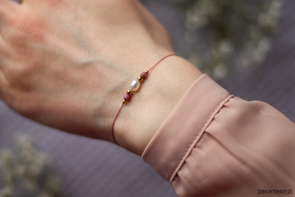 Bransoletka na jedwabnej nici ze słodkowodną perłą hodowaną oraz rodonitem ozdobiona złotymi kuleczkami ze stali szlachetnej. Bransoletkę można regulować za pomocą wygodnego stopera.