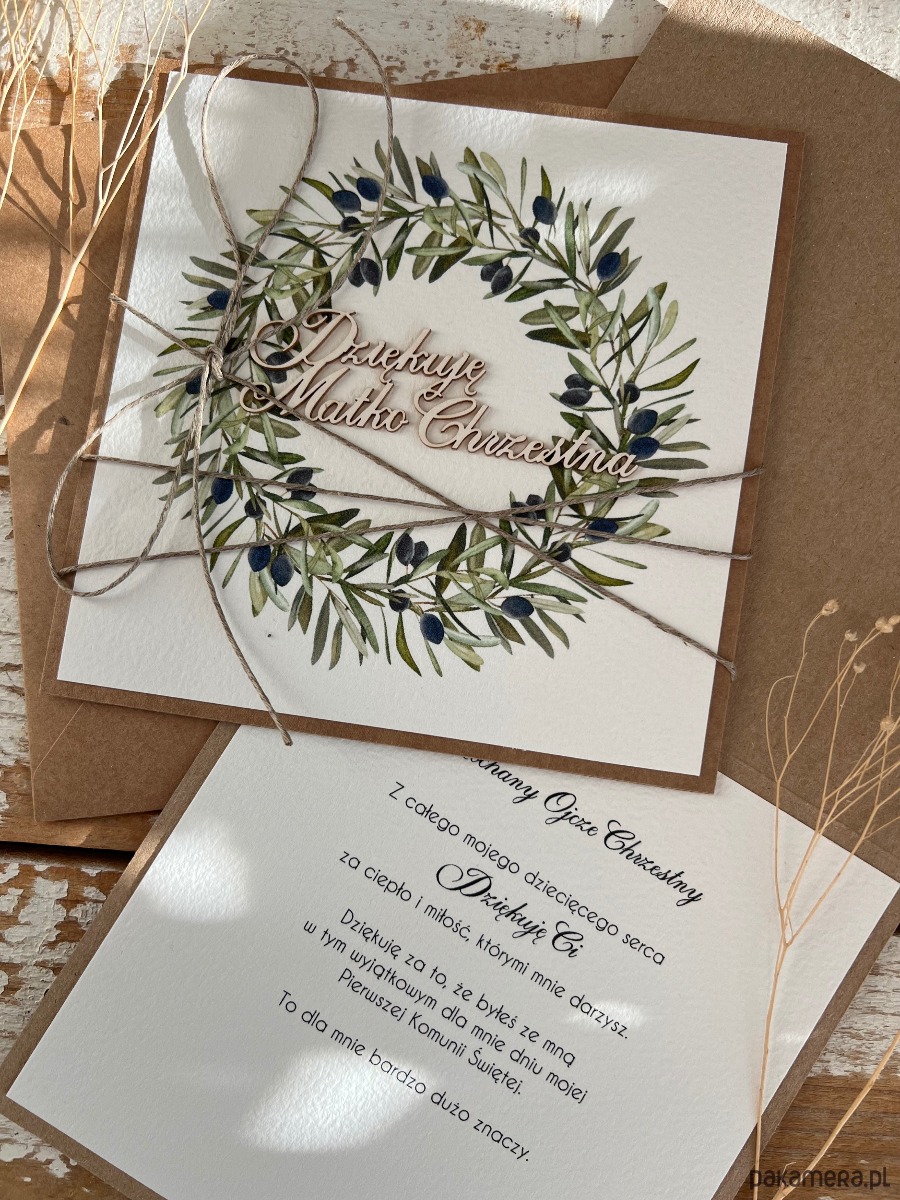 W środku wklejona jest kartka z papieru bawełnianego, z gotowymi życzeniami dostosowanymi do matki chrzestnej.
