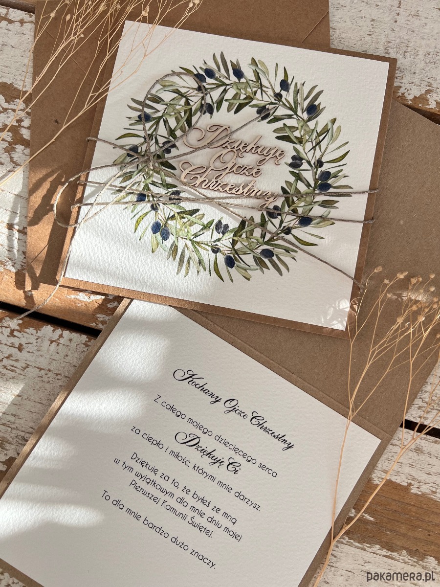 W środku wklejona jest kartka z papieru bawełnianego, z gotowymi życzeniami dostosowanymi do matki chrzestnej.