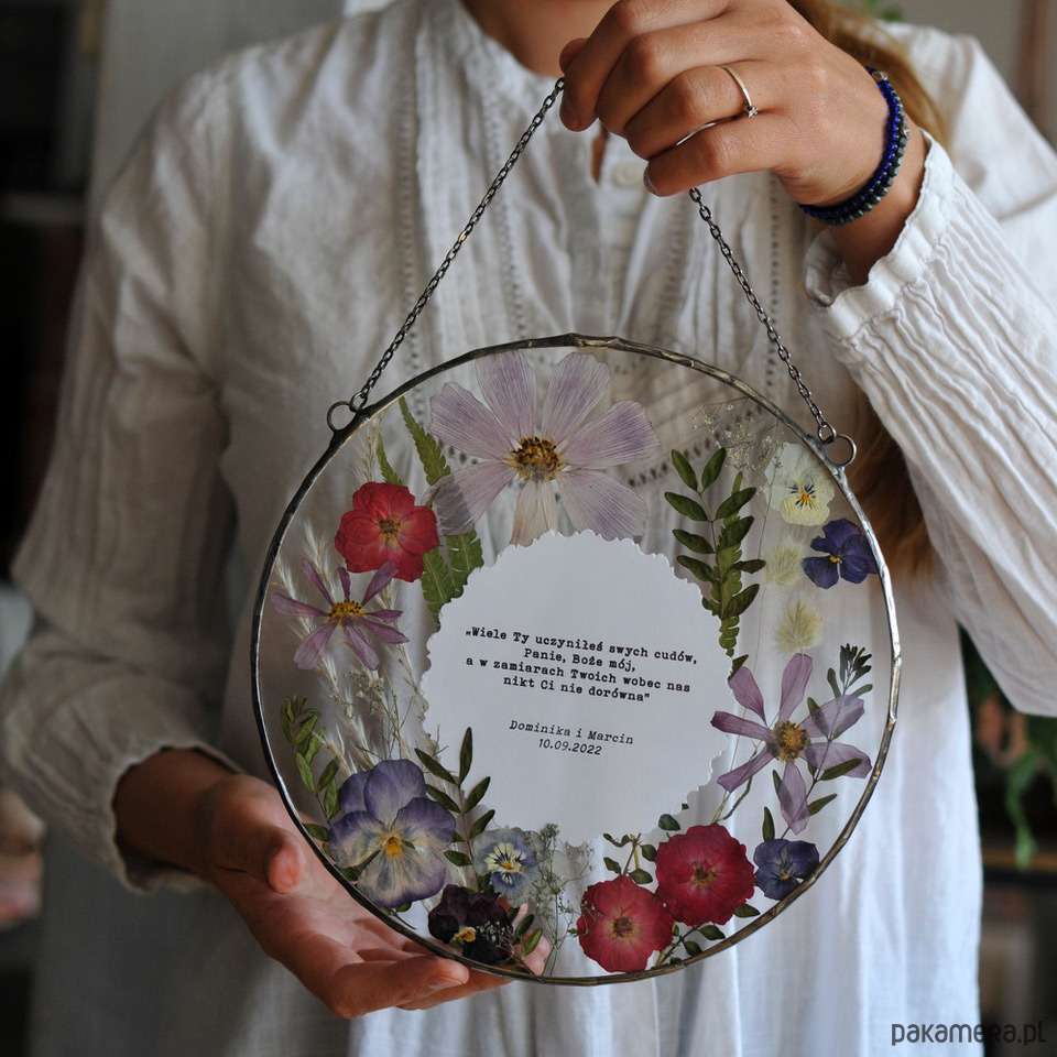 Zestaw dekoracyjnych witraży z kompozycją z suszonych roślin, które wykonane zostały w całości w pracowni rękodzieła MARIAELA.