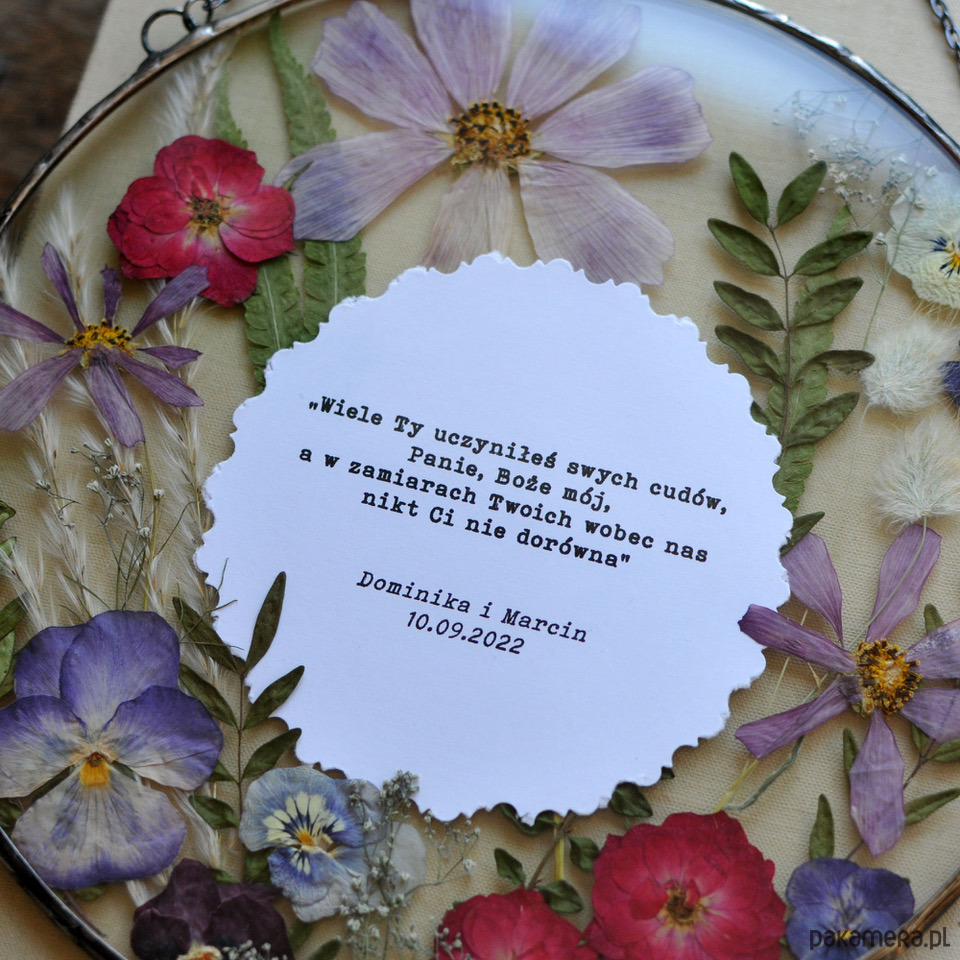 Rozmaite suszone kwiaty zamknięte w oryginalnym wzorze dekoracyjnym, oplatają wydrukowany tekst.