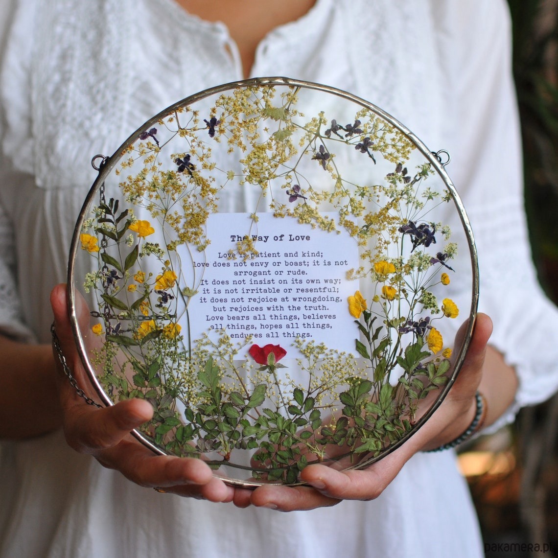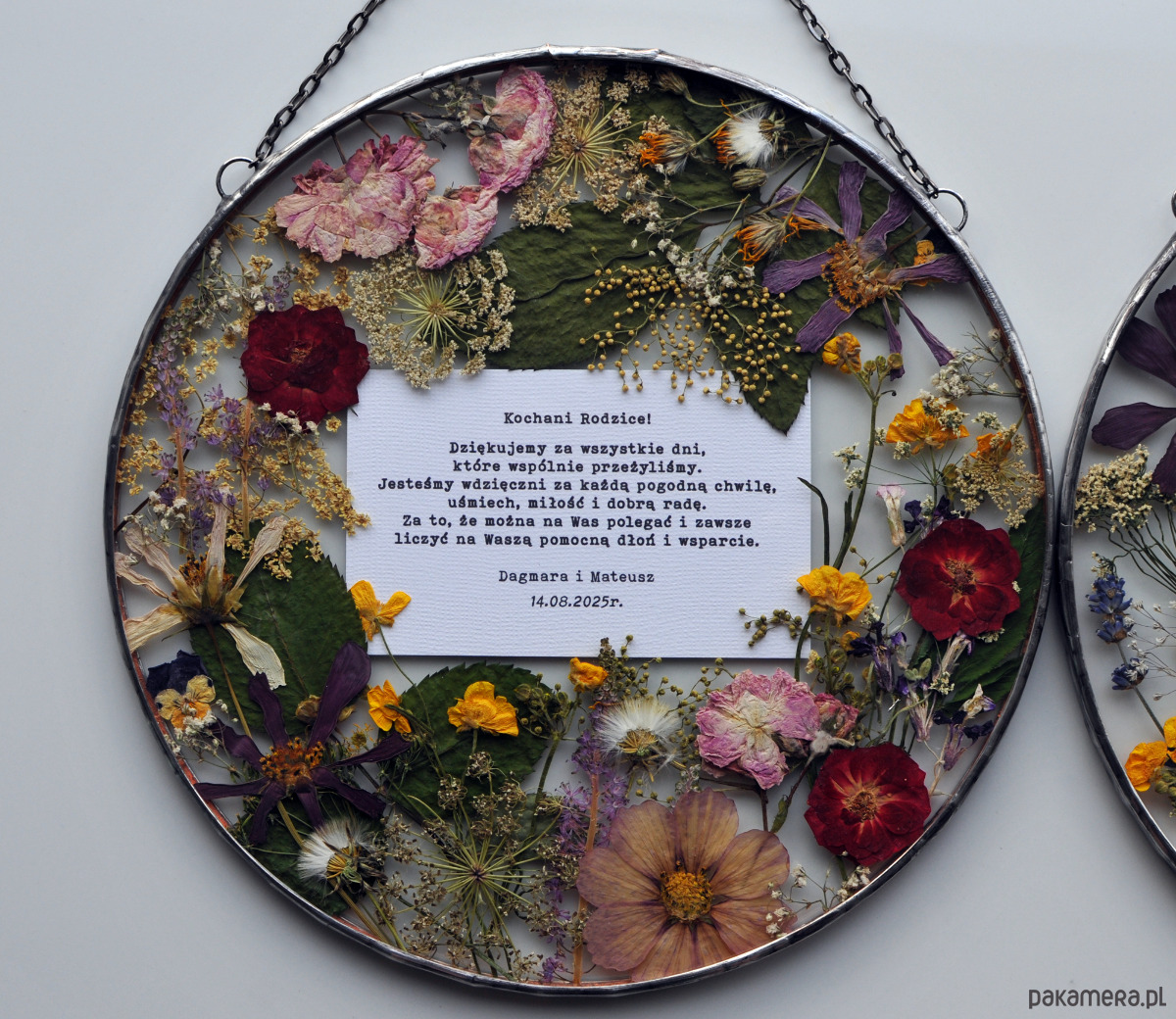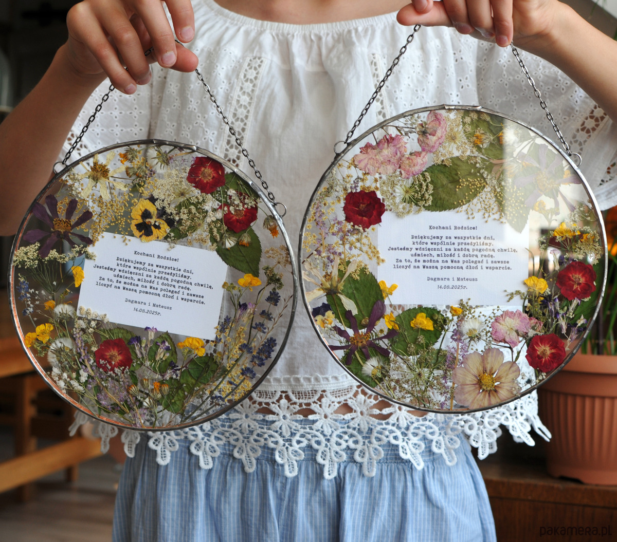 Zestaw dekoracyjnych witraży z kompozycją z suszonych roślin, które wykonane zostały w całości w pracowni rękodzieła MARIAELA.