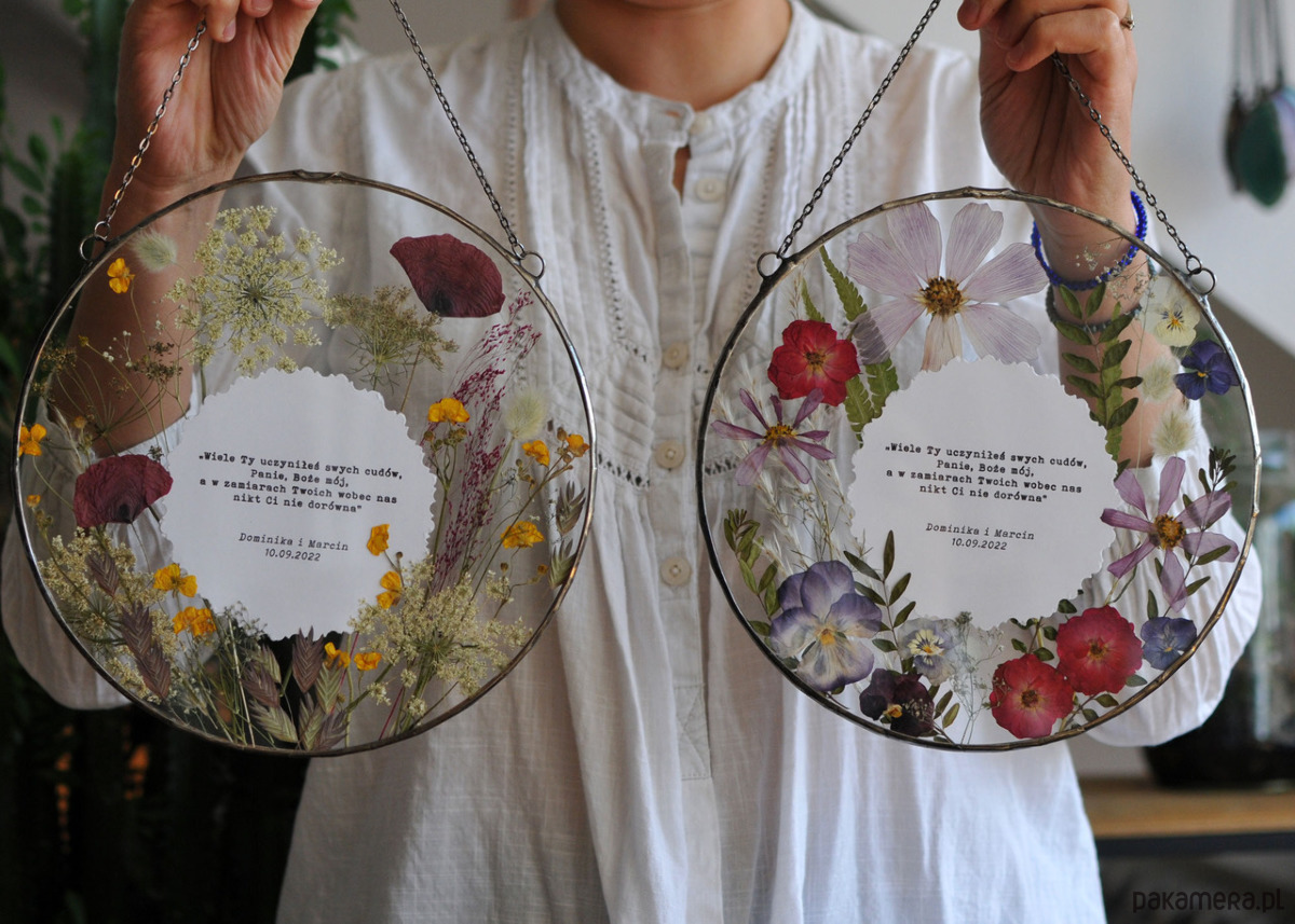 Zestaw dekoracyjnych witraży z kompozycją z suszonych roślin, które wykonane zostały w całości w pracowni rękodzieła MARIAELA.