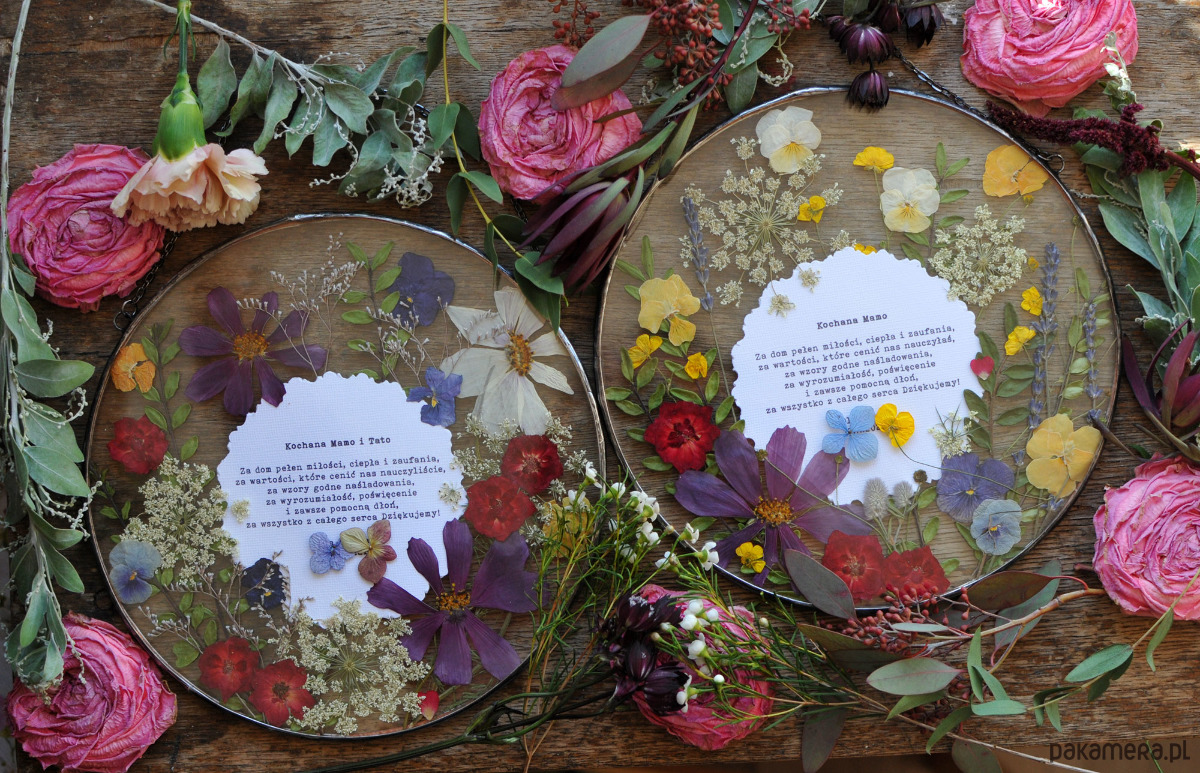Rozmaite suszone kwiaty zamknięte w oryginalnym wzorze dekoracyjnym, oplatają wydrukowany tekst.