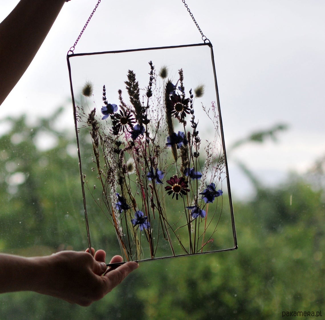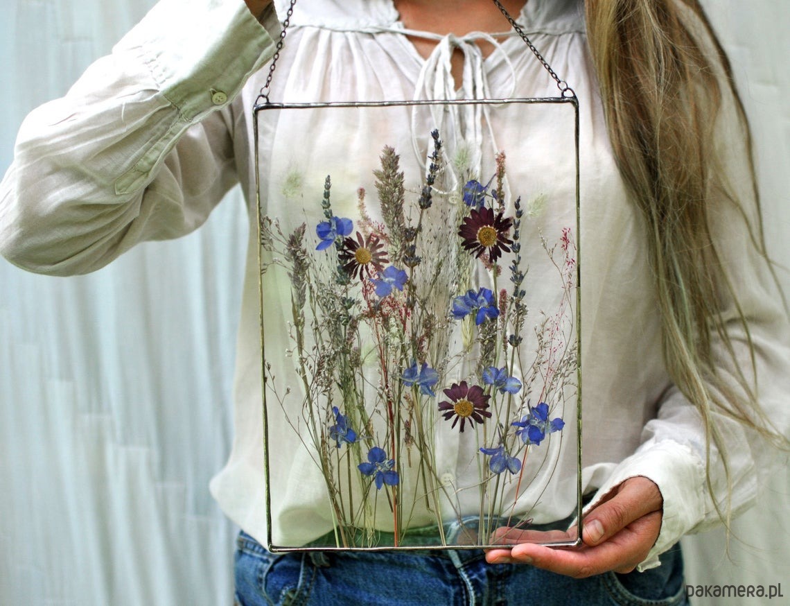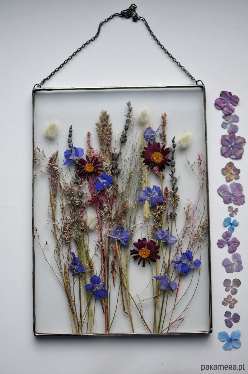 Szklany witraż formatu A4 z dekoracją z suszonych kwiatów i polnych roślin ??