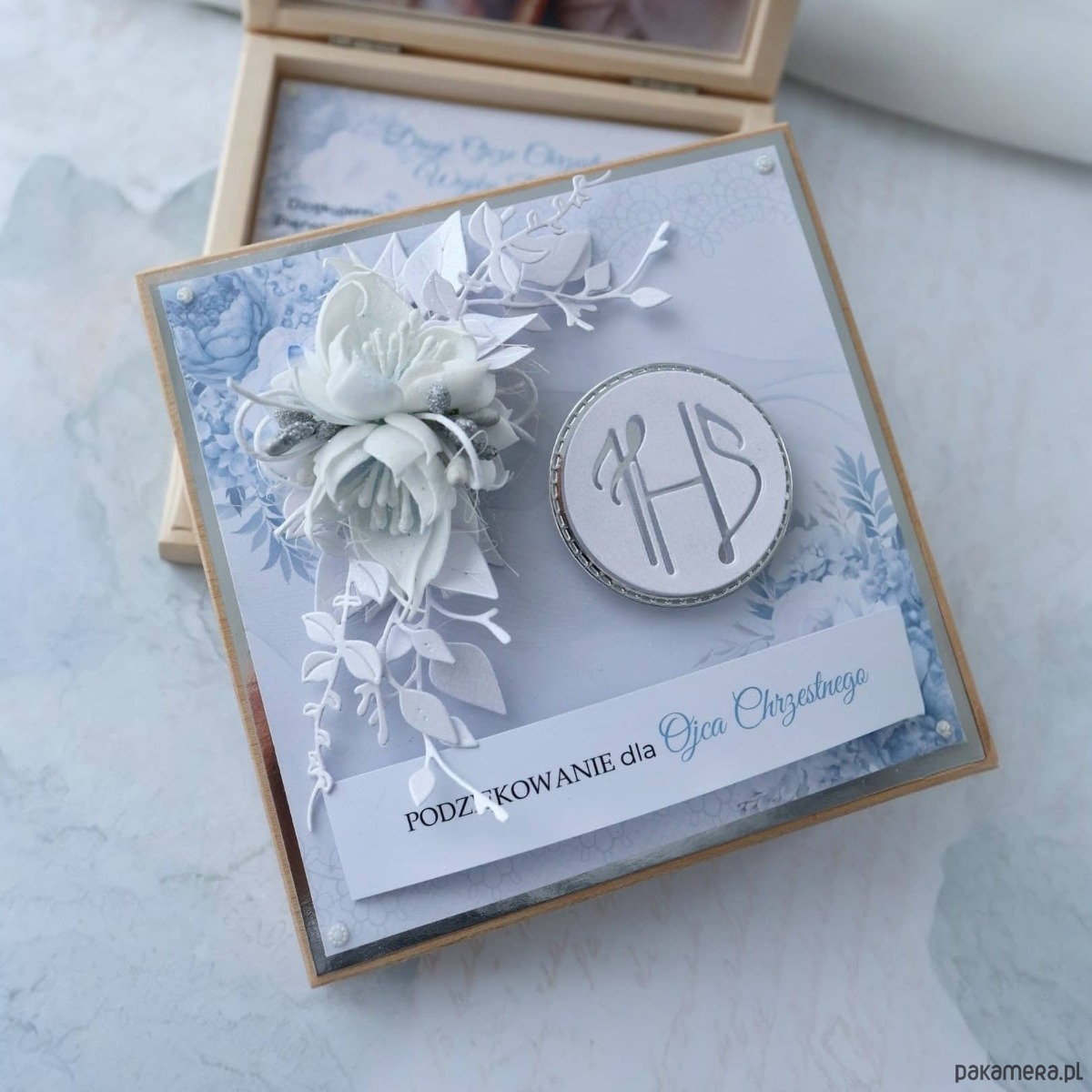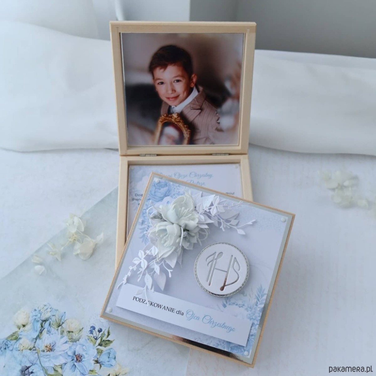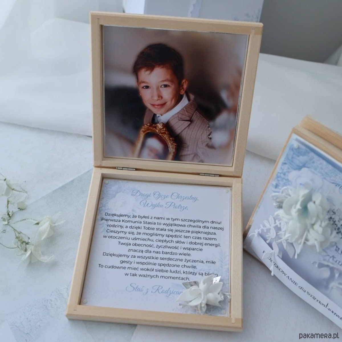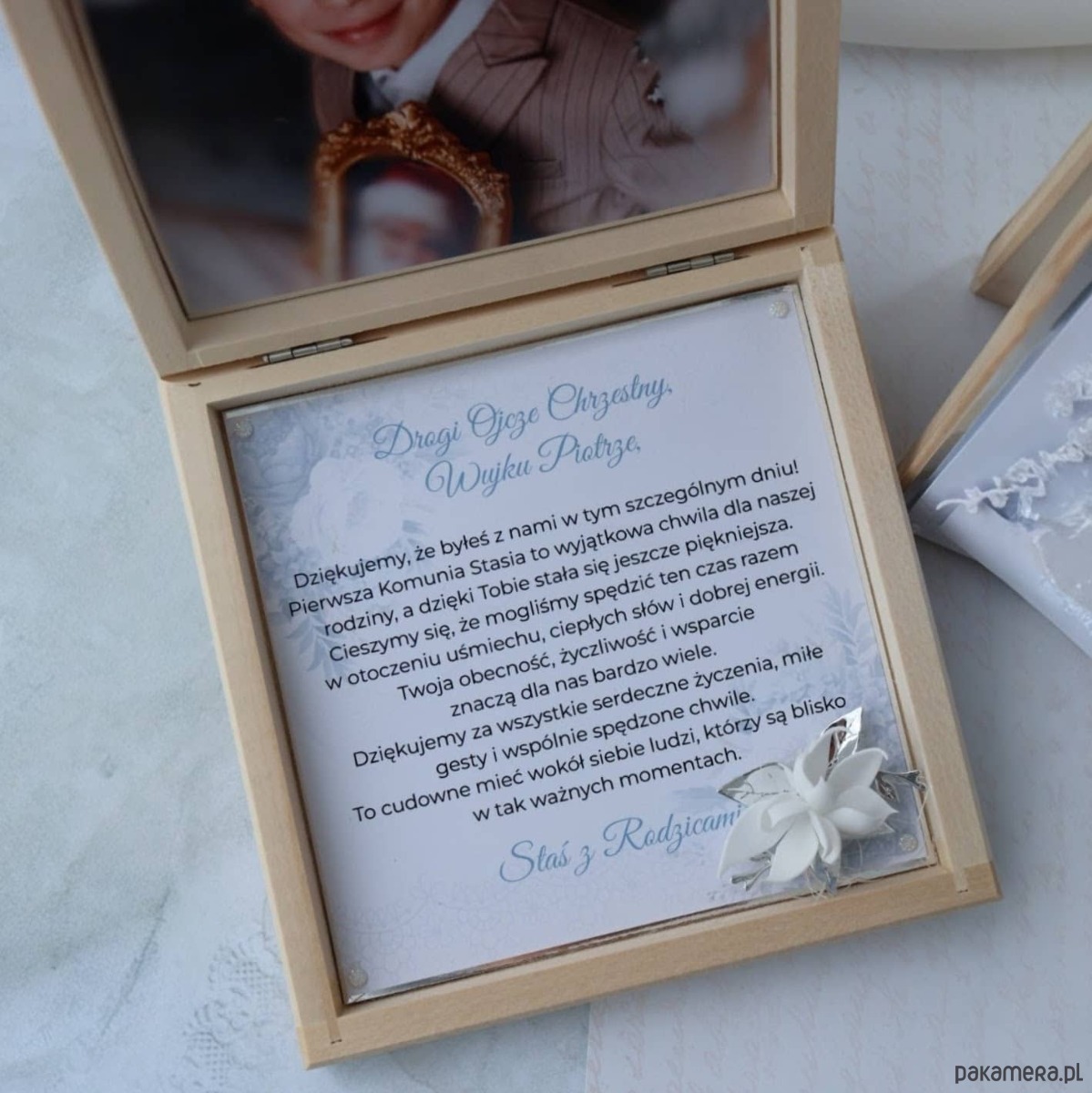 Szukasz prezentu dla Rodziców Chrzestnych lub Dziadków, który będzie jednocześnie pamiątką i formą podziękowania? Ta pamiątka w drewnianym pudełku pozwala wyrazić wdzięczność w elegancki sposób.