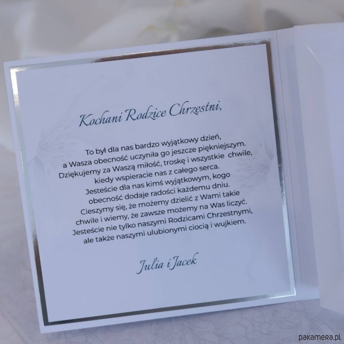 W środku znajduje się tekst podziękowania (do wyboru lub własny), a także możliwość dodania kartki z kalendarza lub zdjęcia dziecka.