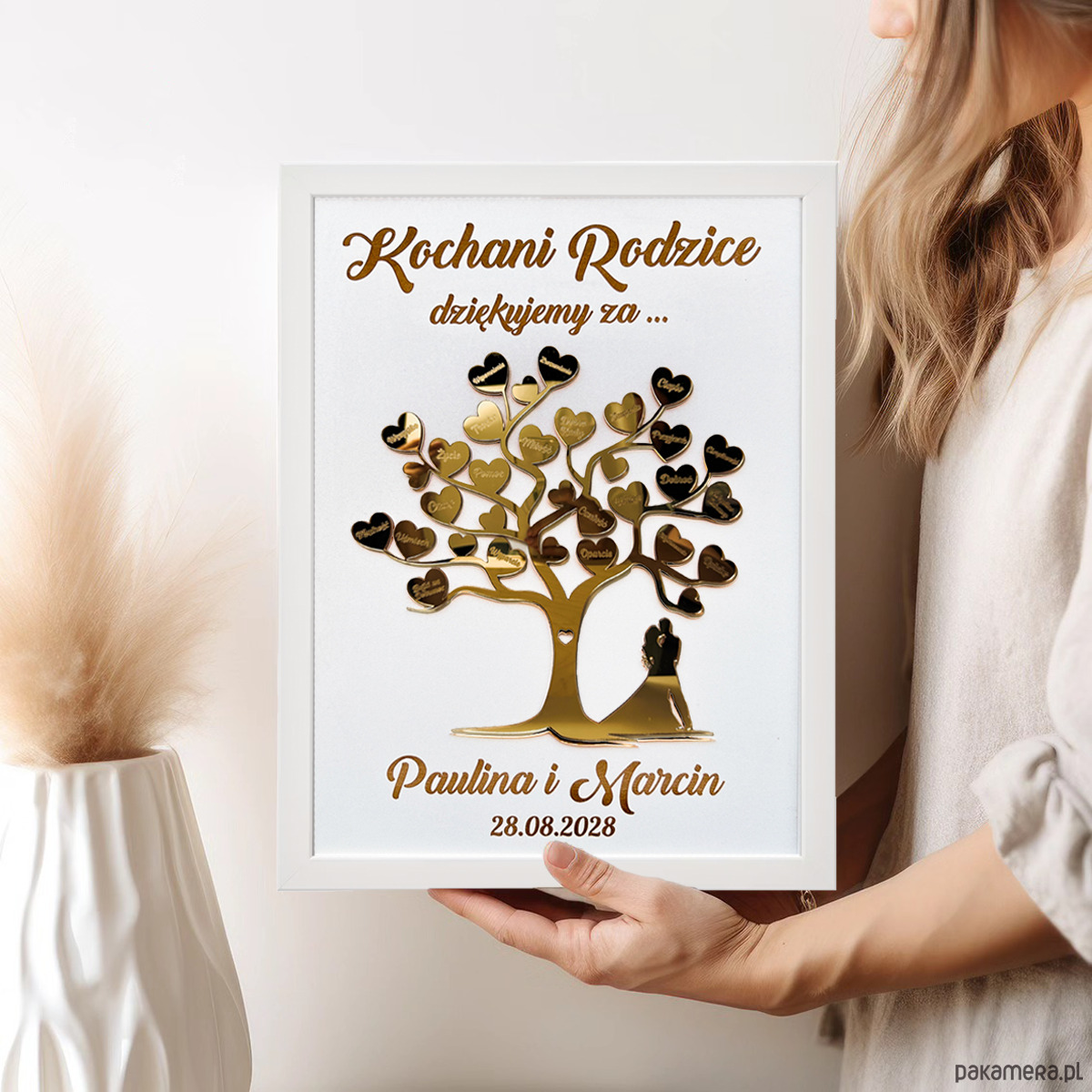 Spersonalizowane podziękowania w formie obrazu ze złotym drzewkiem z wyrazami wdzięczności, to bardzo osobisty prezent – wzruszenie rodziców gwarantowane. Obraz w formie 3D nadaje ramce głębi i trójwymiarowości, co czyni ją nie tylko podziękowaniem, ale również dekoracją wnętrza. Dzięki wyjątkowemu wyglądowi i estetyce, będzie stanowić ozdobę ścienną i przyciągnie uwagę każdego, kto ją zobaczy.