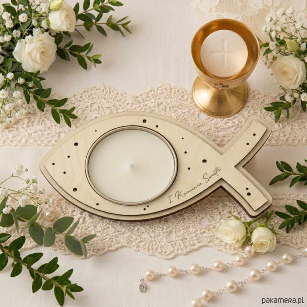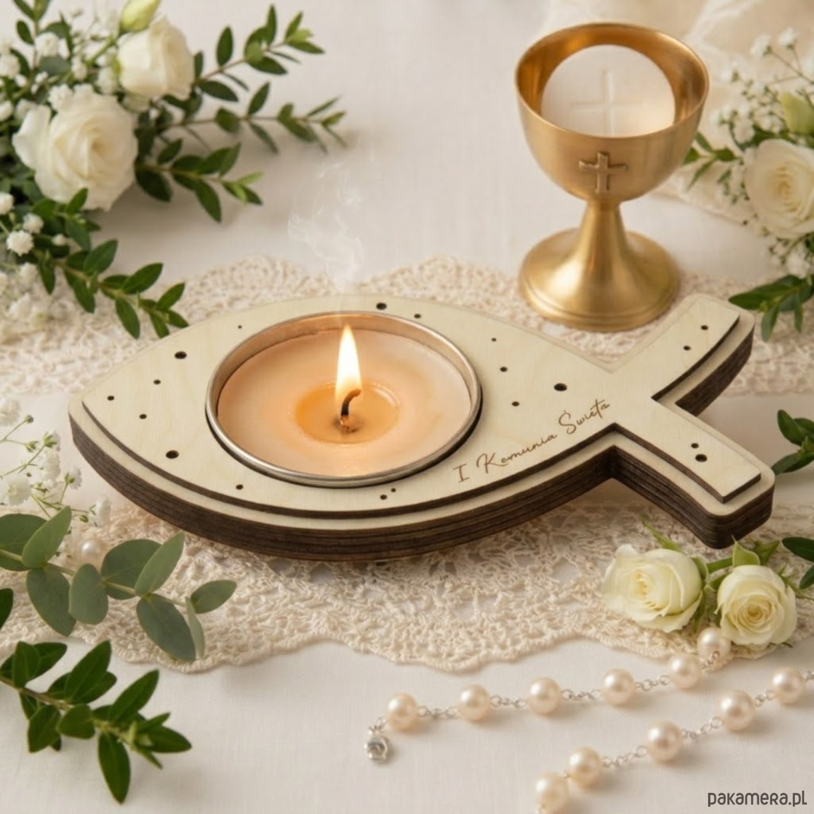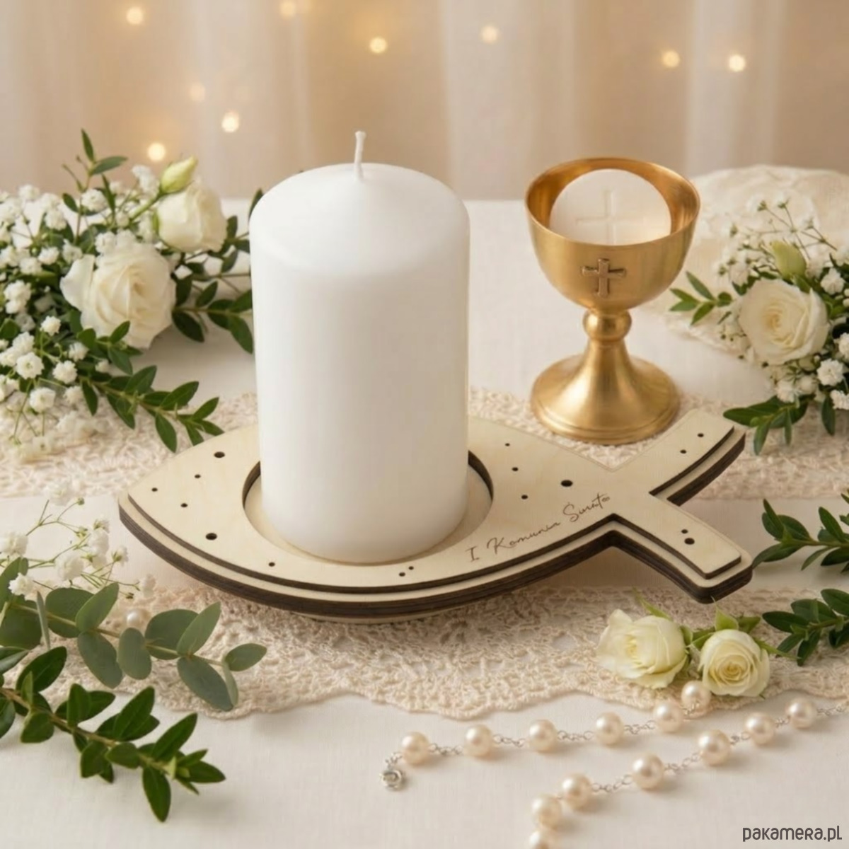 Podkreśl wyjątkowość Pierwszej Komunii Świętej dzięki tej pięknej, drewnianej podkładce pod świeczkę. Delikatny, trwały grawer sprawia, że każdy świecznik staje się niepowtarzalną dekoracją, która zachwyci gości i doda uroku każdemu stołowi.