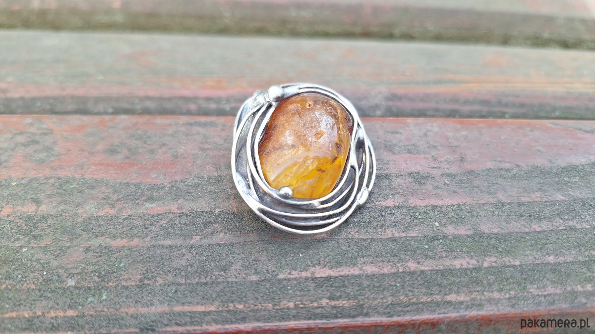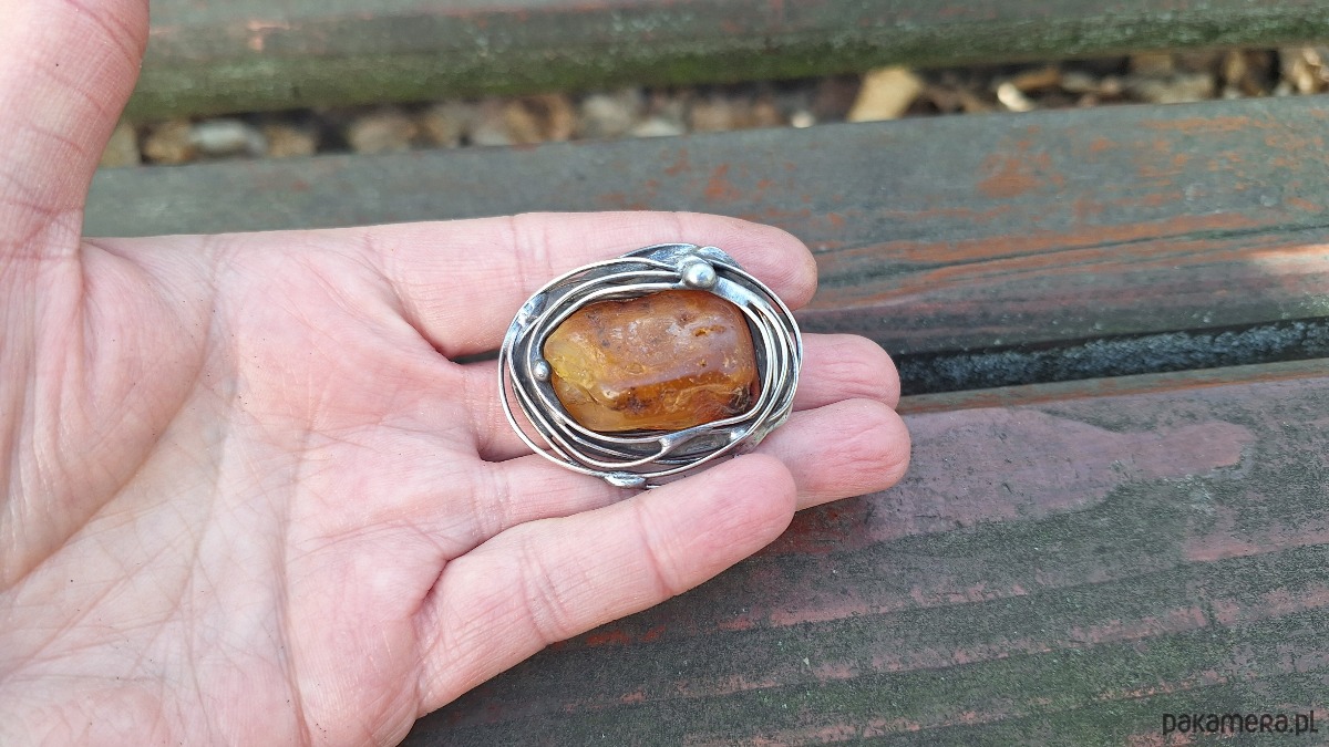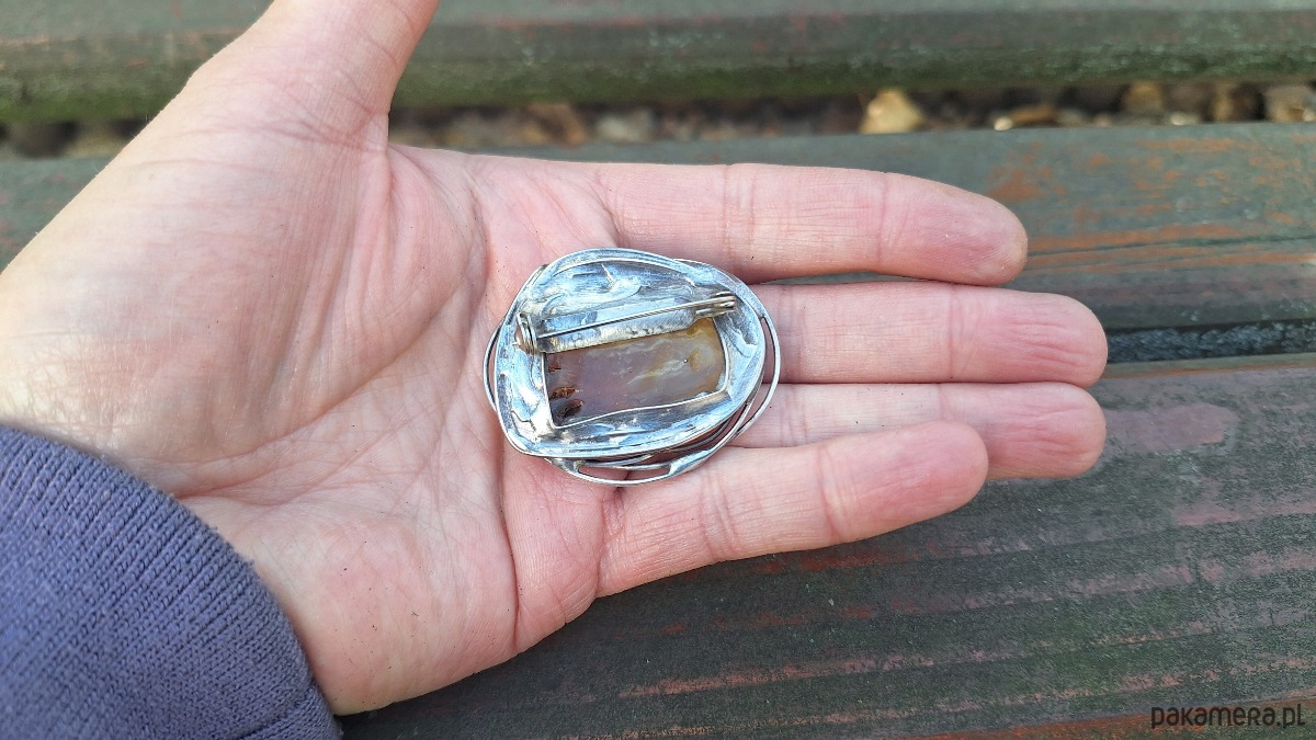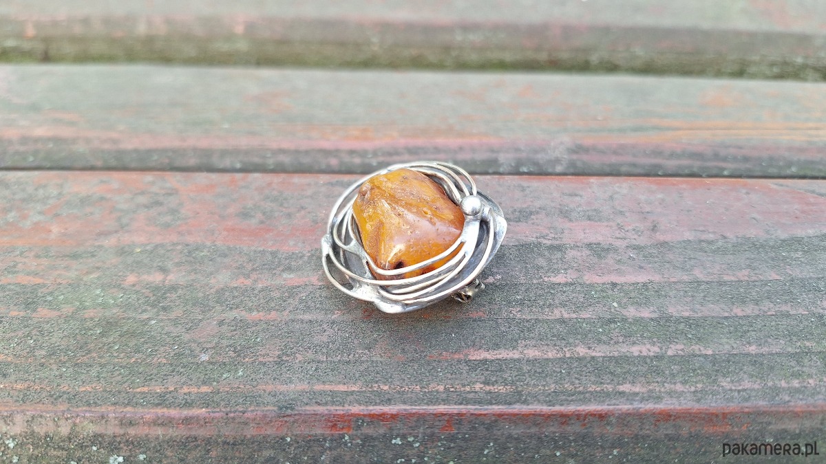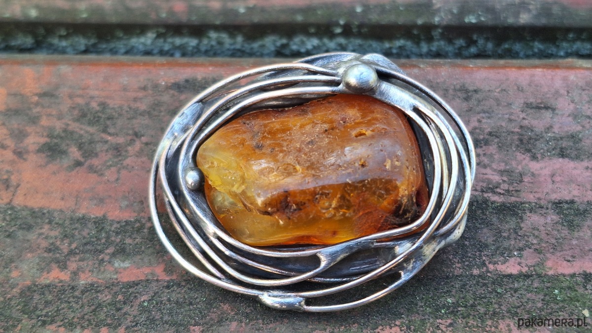 Broszka wykonana z miedzi, cyny i bursztynu. Wymiary ok. 4.5 na 3.5 cm. Zapięcie metalowe.