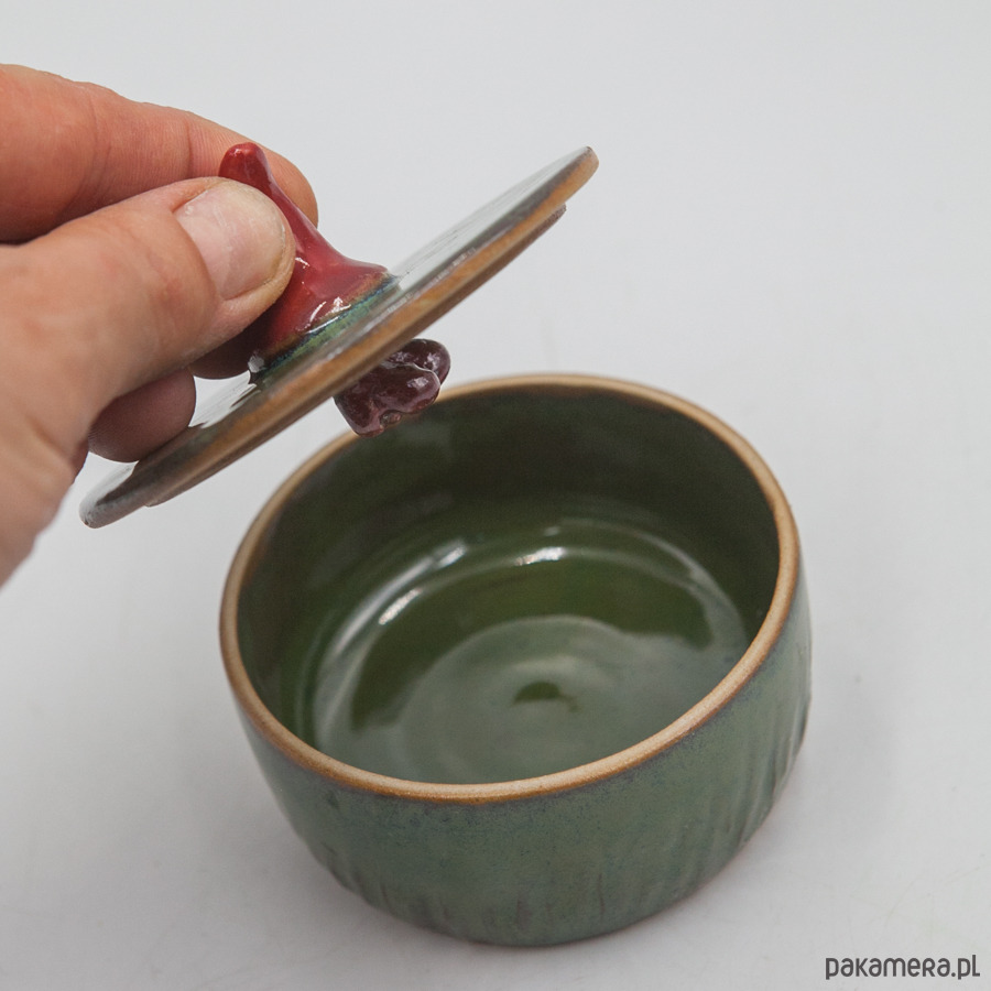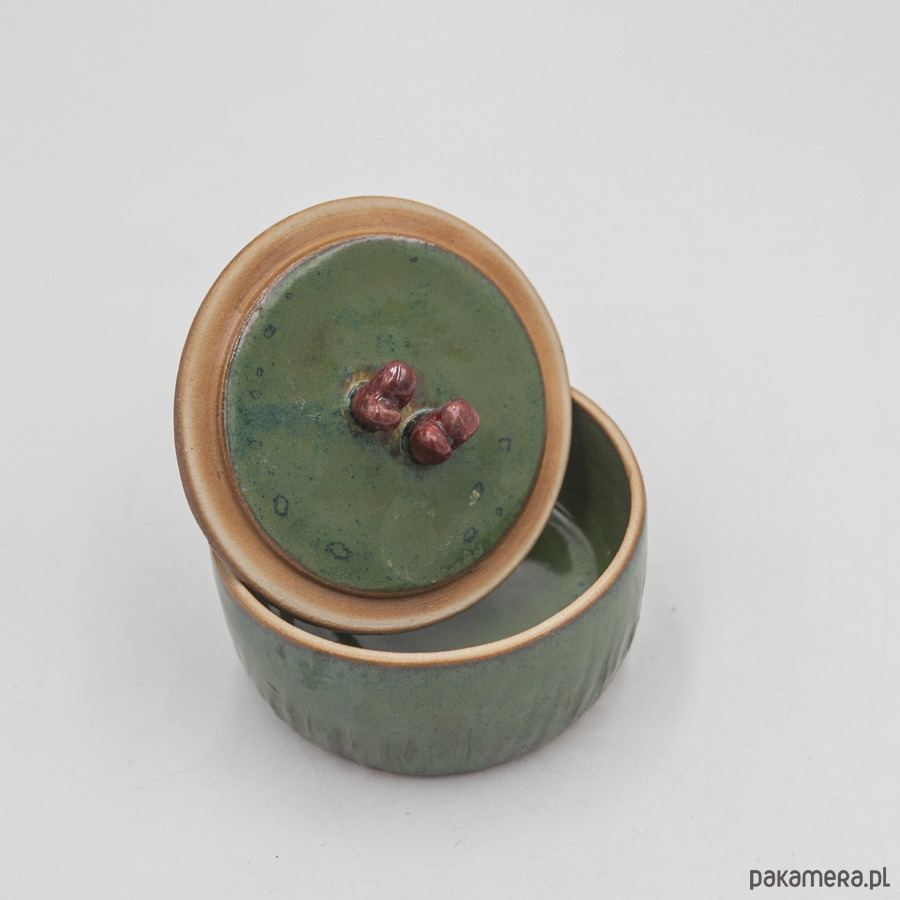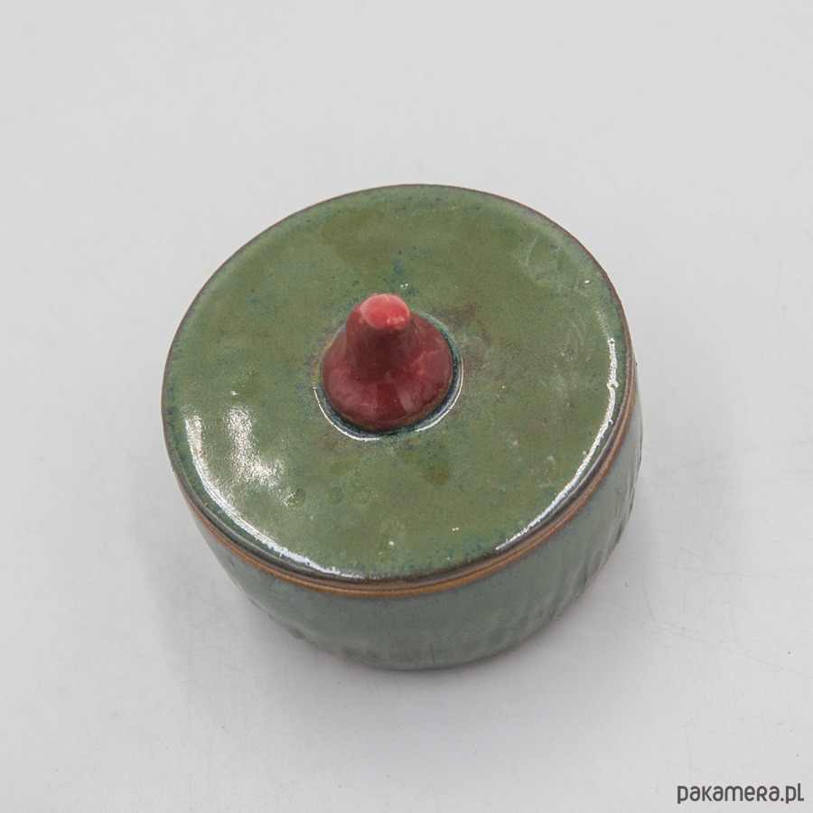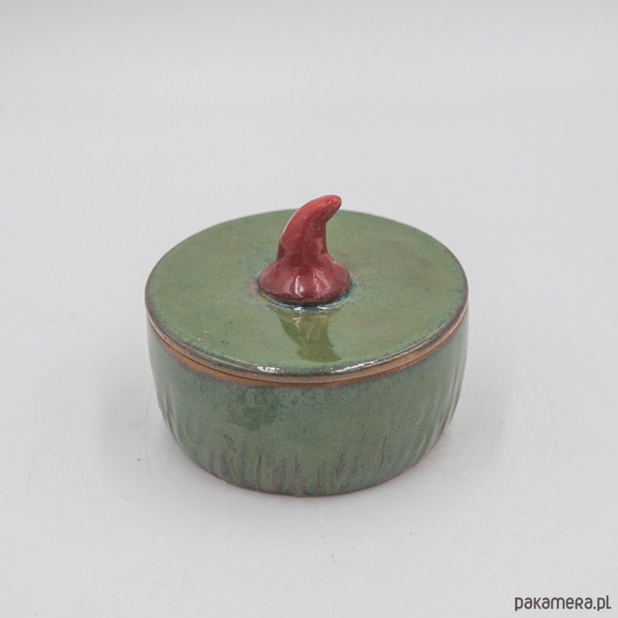 Zielone pudełeczko wytoczone na kole garncarskim, przykrywka ozdobiona kapeluszem (na górze) i czerwonymi butkami (od spodu).
