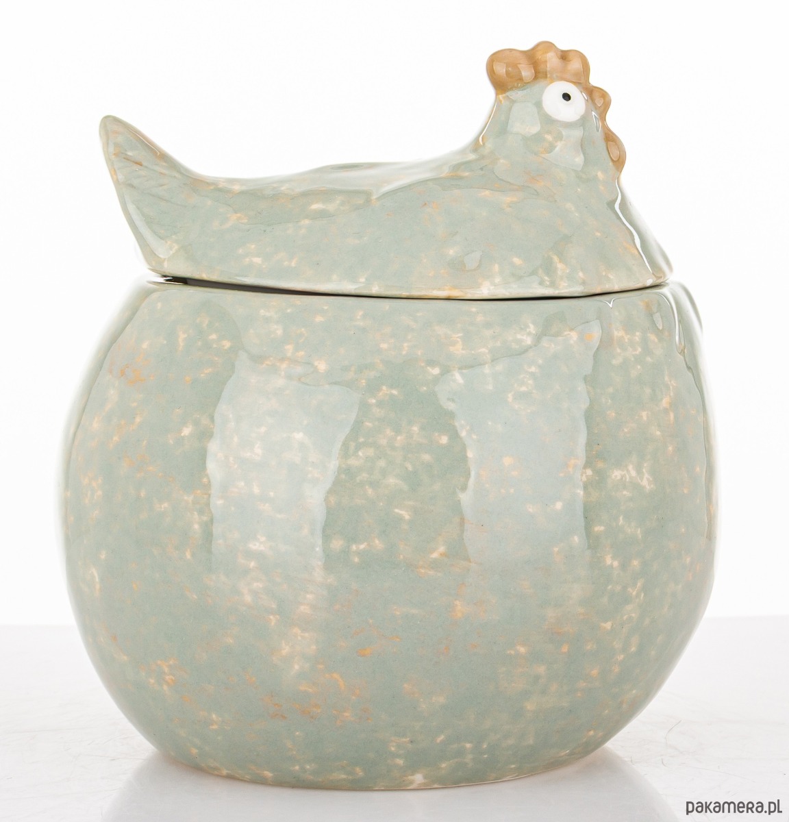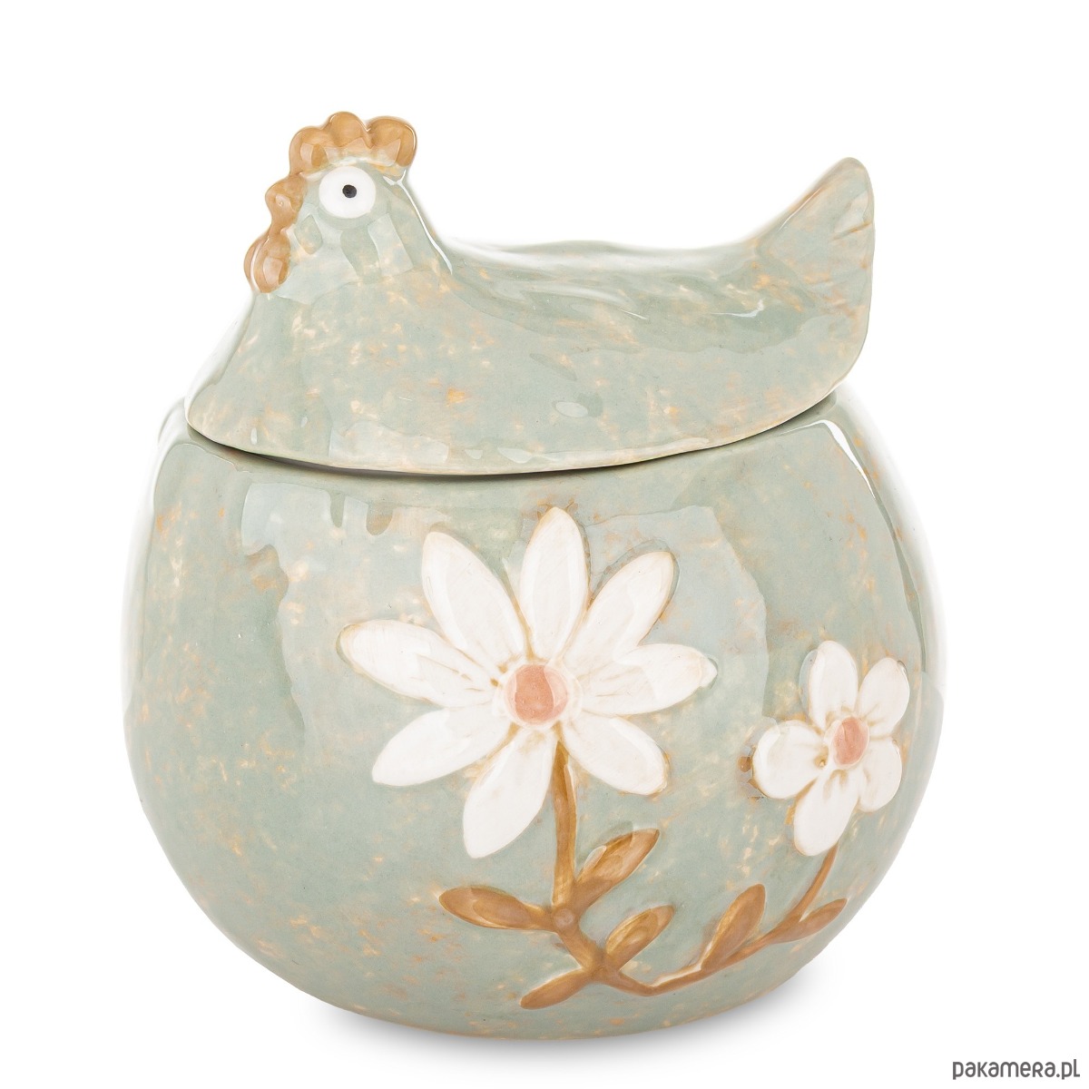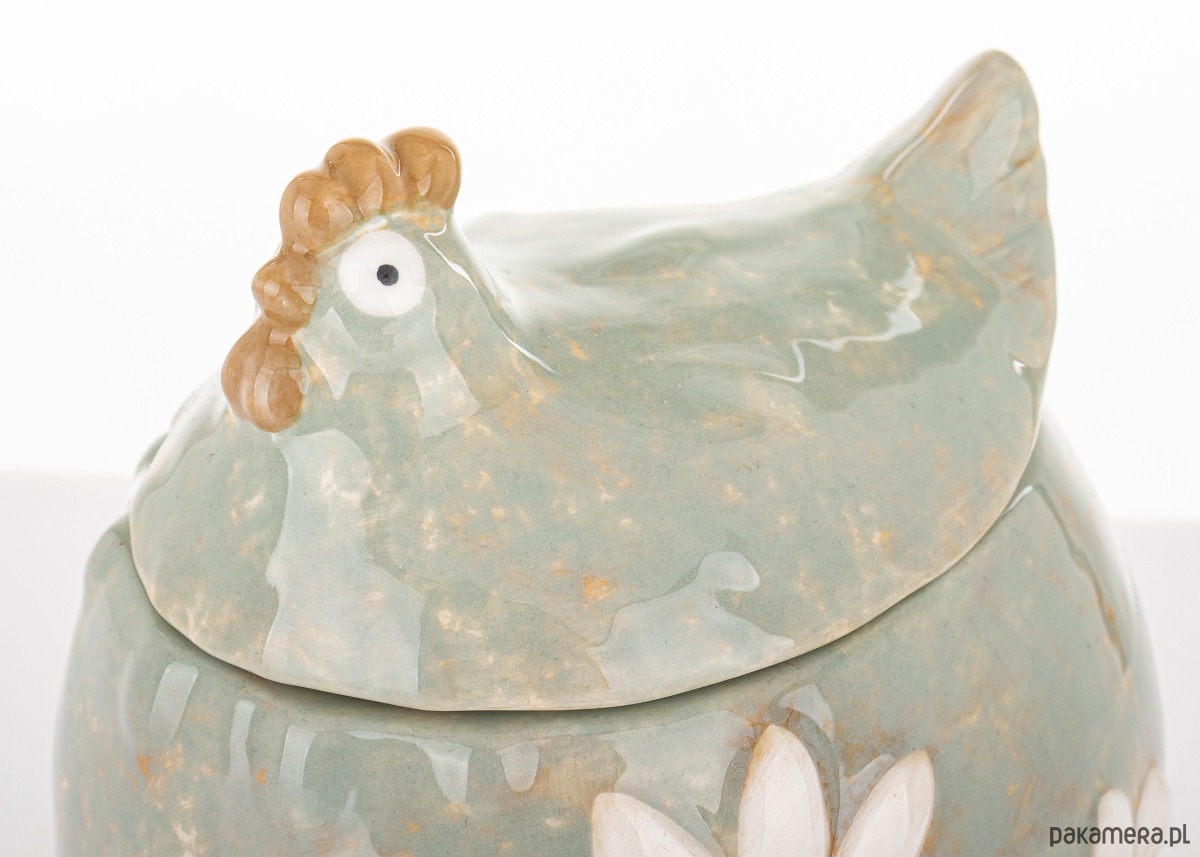 Pojemnik o okrągłym kształcie wykonany został z błękitno-szarej ceramiki. Przykrywka z figurą kury oraz namalowane białe kwiatki sprawiają, że pojemnik może być ozdobą kuchni i jadalni. Pudełko może mieć szerokie zastosowanie - na słodycze, w łazience na drobne przybory, w kuchni na przyprawy typu goździki, makarony, płatki śniadaniowe itp.