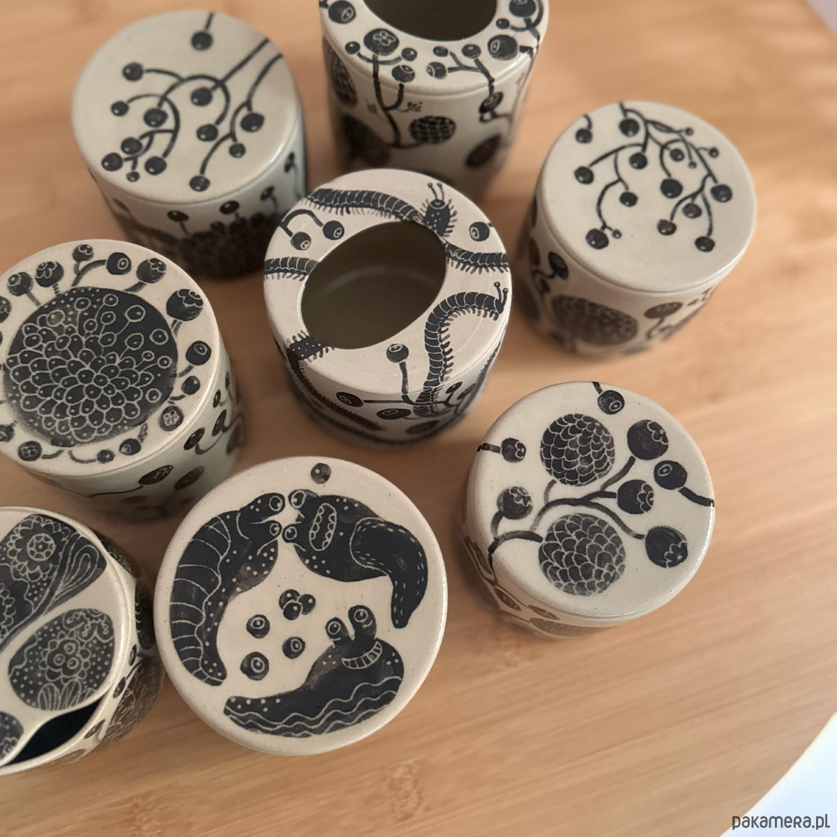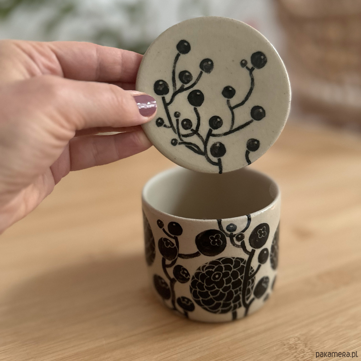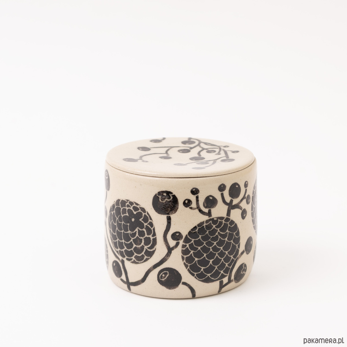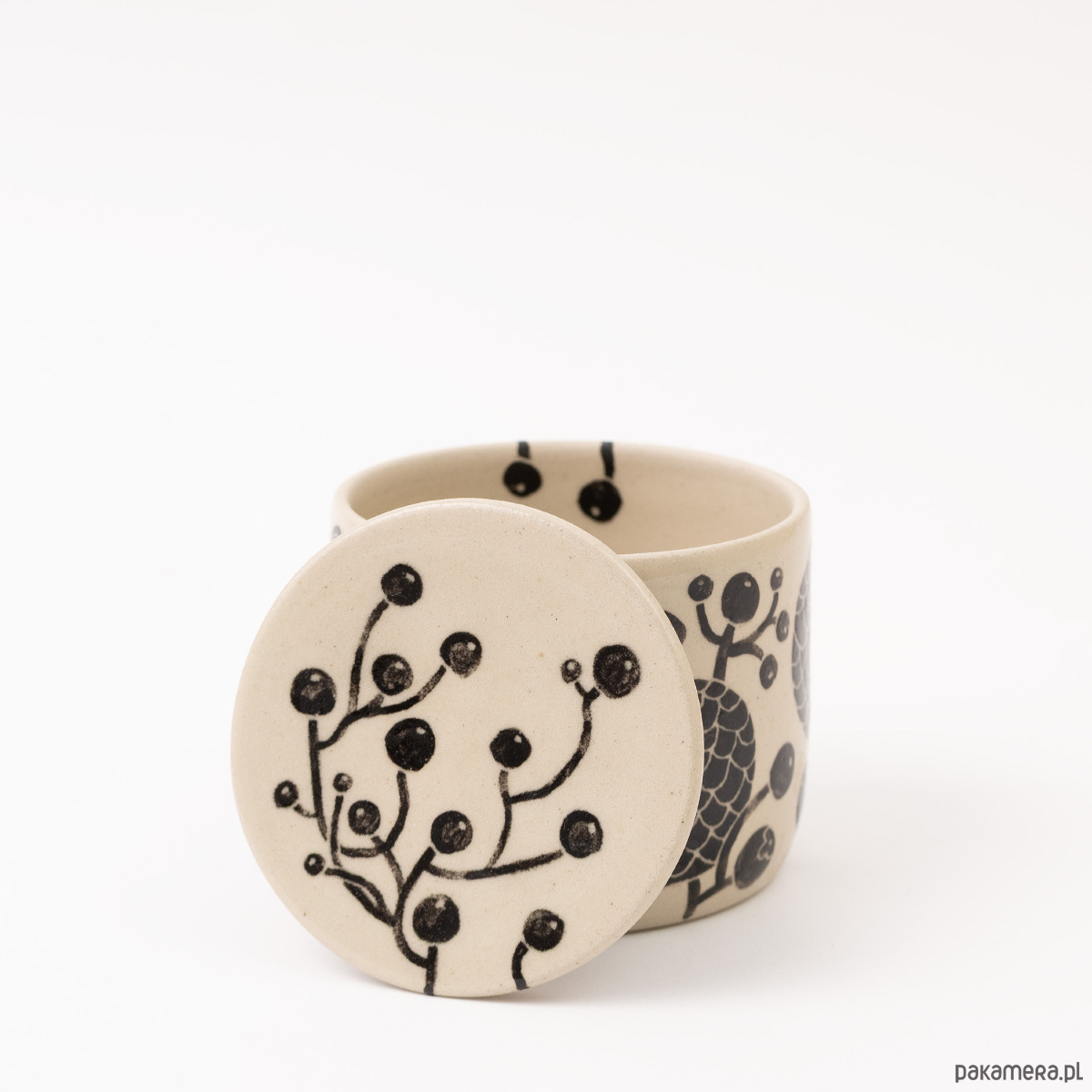 Kolory: naturalnie beżowy kolor gliny + malowany czarny wzór + transparent (szkliwo błyszczące). Pojemnik szkliwiony na zewnątrz i wewnątrz.