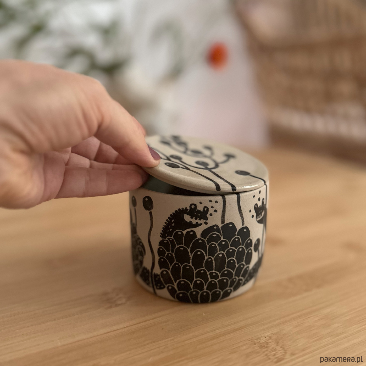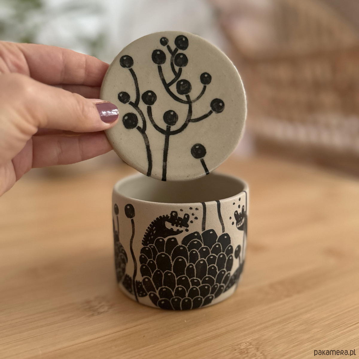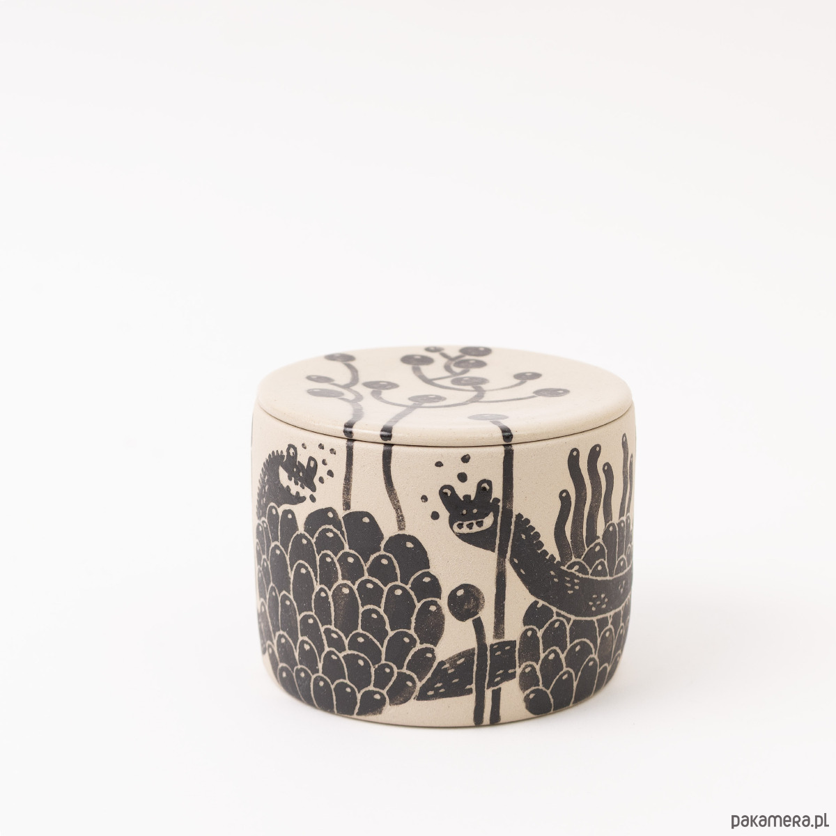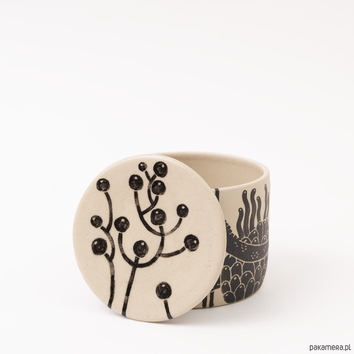 Kolory: naturalnie beżowy kolor gliny + malowany czarny wzór + transparent (szkliwo błyszczące). Pojemnik szkliwiony wewnątrz i matowy na zewnątrz, przykrywka szkliwiona z obu stron.