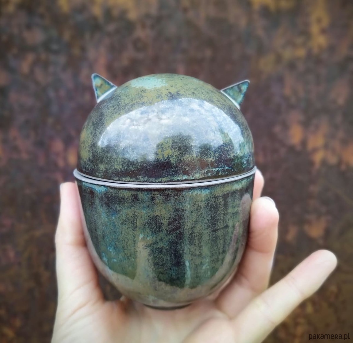 Ceramiczny, delikatnie nieregularny pojemnik , ręcznie wykonany z mocno spieczonej barwionej kamionki, szkliwiony zielonobrązowym szkliwem, wnętrze szkliwione błyszczącym transparentnym szkliwem, przeznaczone do kontaktu z żywnością/ Wymiary: wysokość z pokrywką ok.13cm, średnica ok.9cm