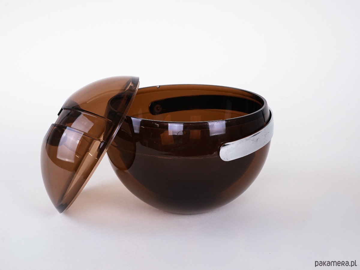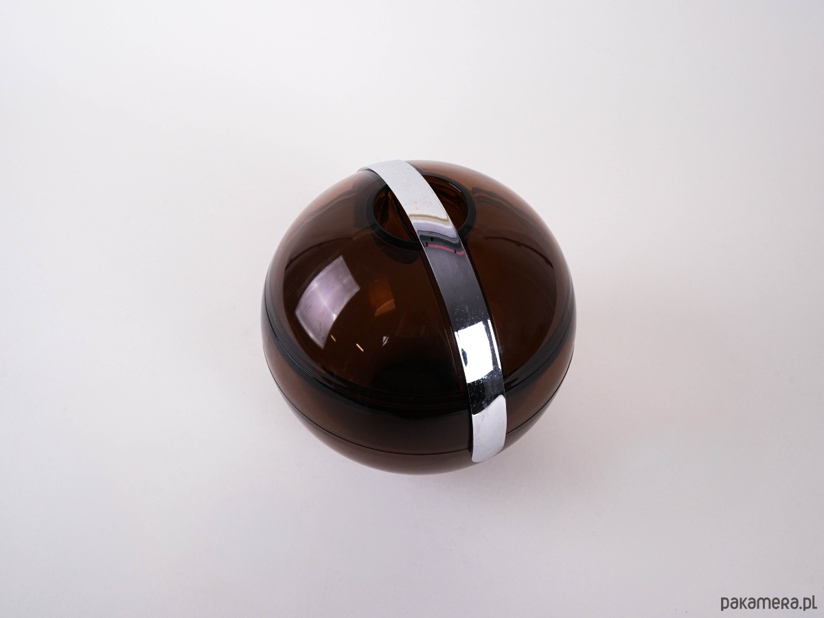 Wykonany z wysokiej jakości akrylu w formie idealnej kuli w kolorze bursztynowym (smoked amber). Charakterystyczny dla estetyki space age / mid-century modern – praktyczny, a jednocześnie niezwykle dekoracyjny. Produkty Guzzini z tego okresu są dziś poszukiwane przez kolekcjonerów i stanowią ikonę włoskiego designu lat 60. i 70. Ten model świetnie komponuje się zarówno w klasycznych, jak i nowoczesnych aranżacjach, dodając wnętrzu elegancji i retro-charakteru.