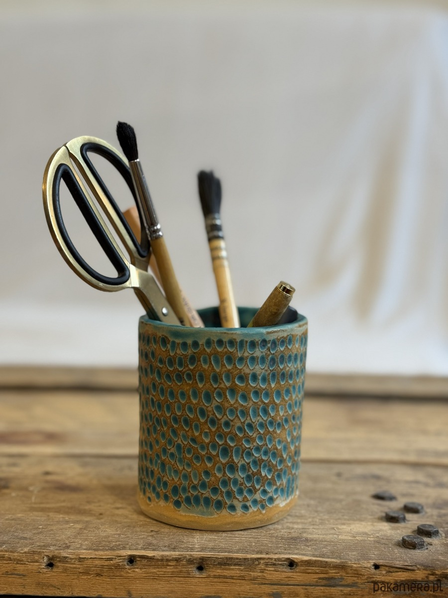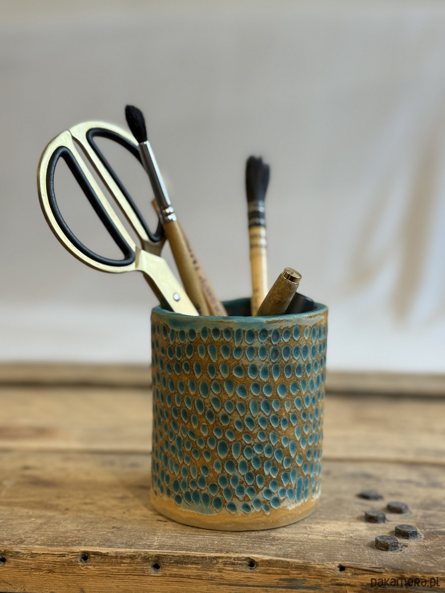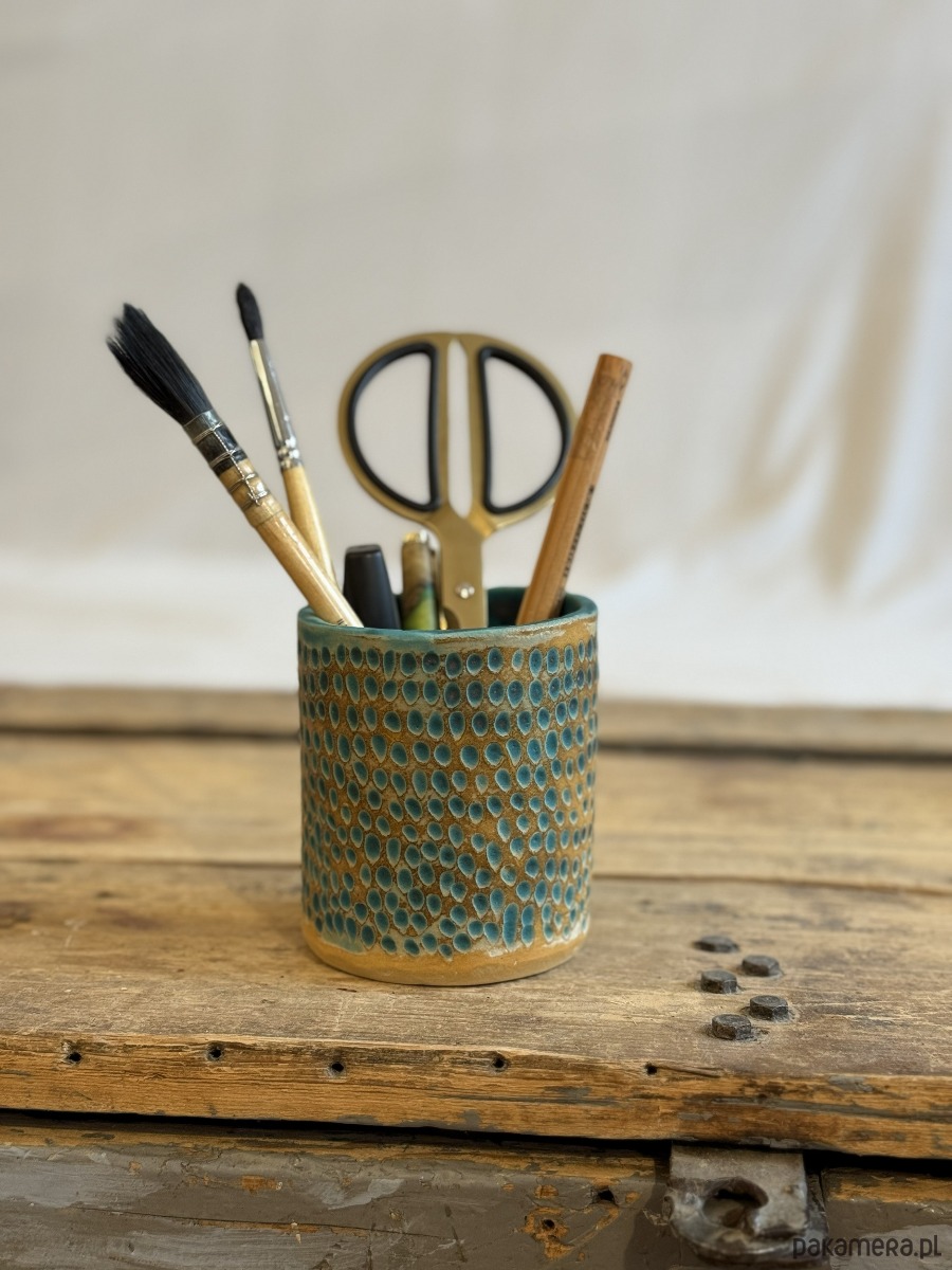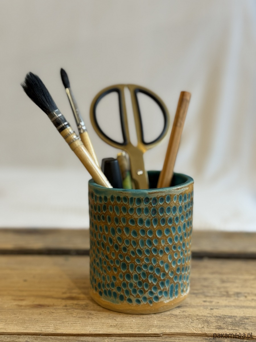 Ceramiczny pojemnik na pędzle, pojemnik na długopisy, można też wykorzystać w łazience, na kwiaty, ponieważ nie przepuszcza wody.