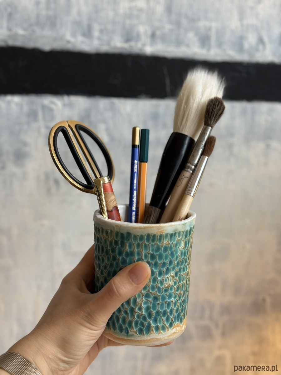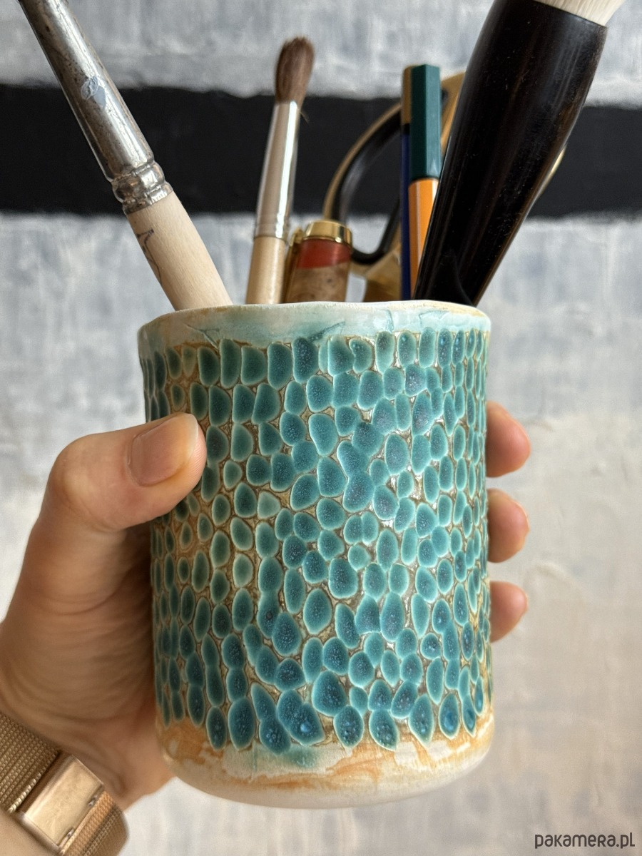Ceramiczny pojemnik na pędzle, pojemnik na długopisy, można też wykorzystać w łazience, na kwiaty, ponieważ nie przepuszcza wody.