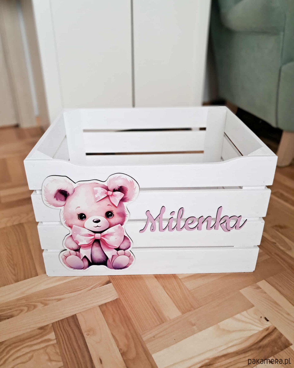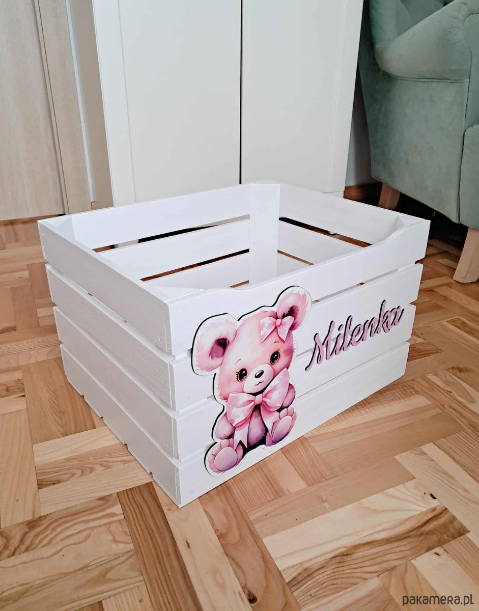 Piękny, funkcjonalny mebel do pokoju dziecka. Skrzynia na zabawki z dekorem misia i imieniem dziecka. Wszystko wykonane z dbałością o każdy szczegół.