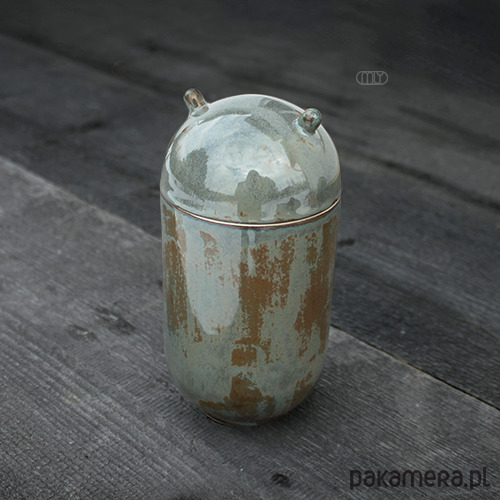 Ceramiczny pojemnik (1sztuka, zielony) ręcznie wykonany z mocno spieczonej kamionki, inspirowany formami organicznymi, szkliwiony efektowną mieszanką szaro zielonych i brązowych szkliw z efektem plamek, wnętrze w kolorze jasnobeżowym. Szkliwo przeznaczone do kontaktu z żywnością, można myć w zmywarce. Wymiary: wysokość z pokrywką ok.15cm, średnica ok.9cm