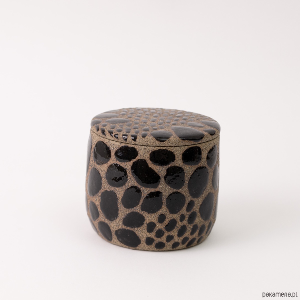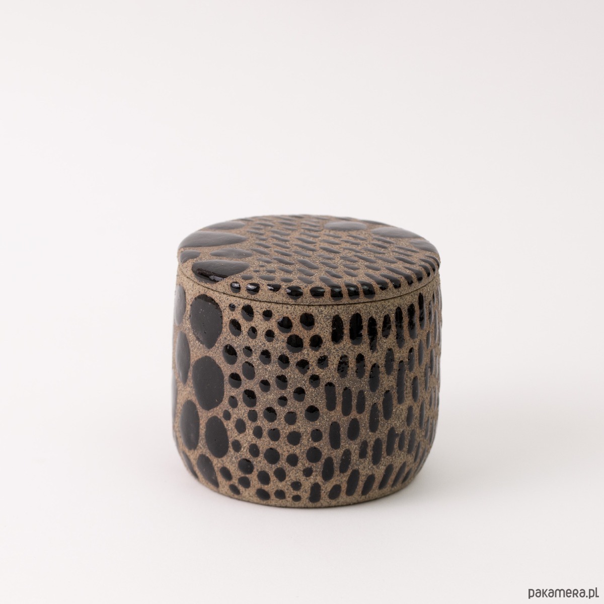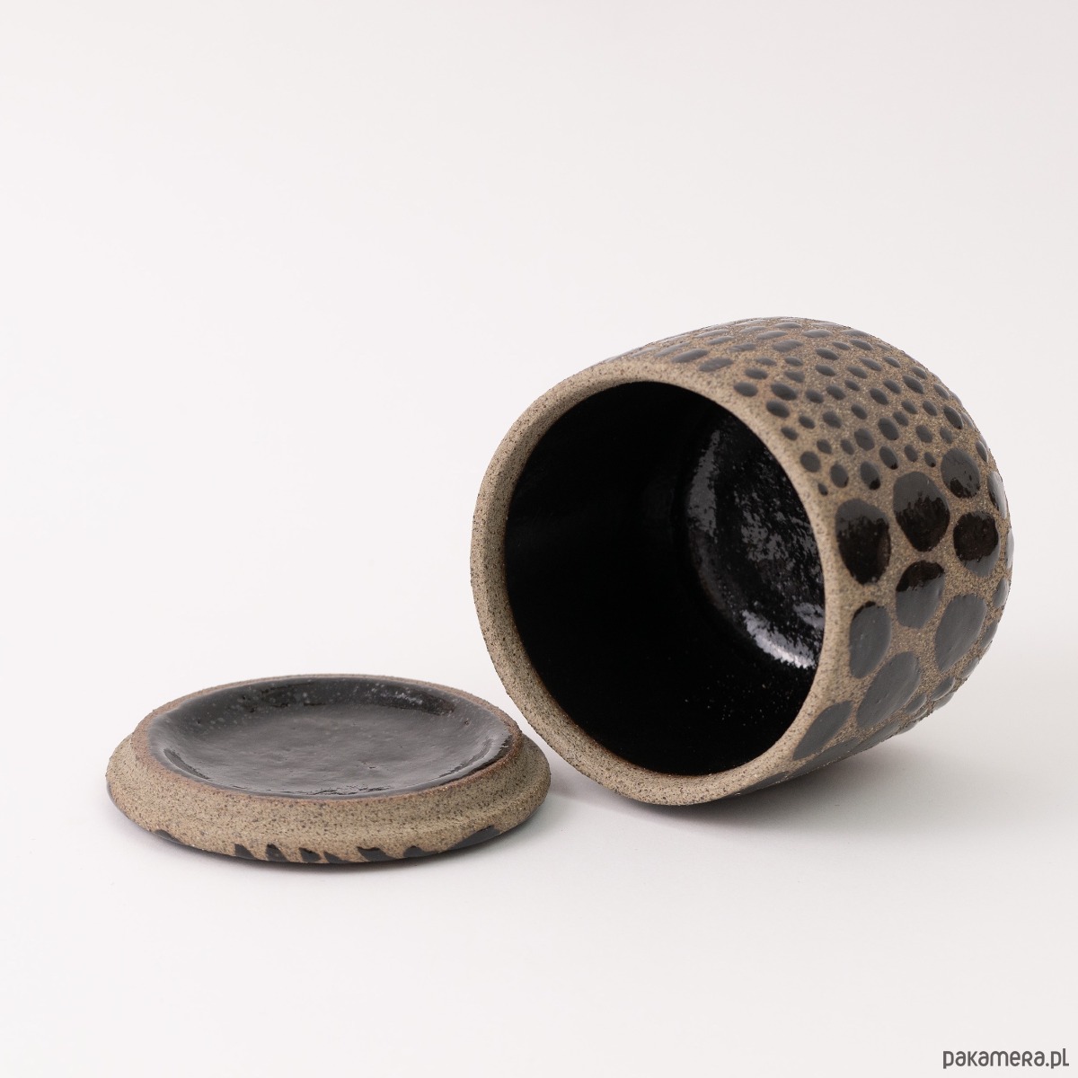 Pojemnik z pokrywką kamionki fragmentarycznie poszkliwionej.