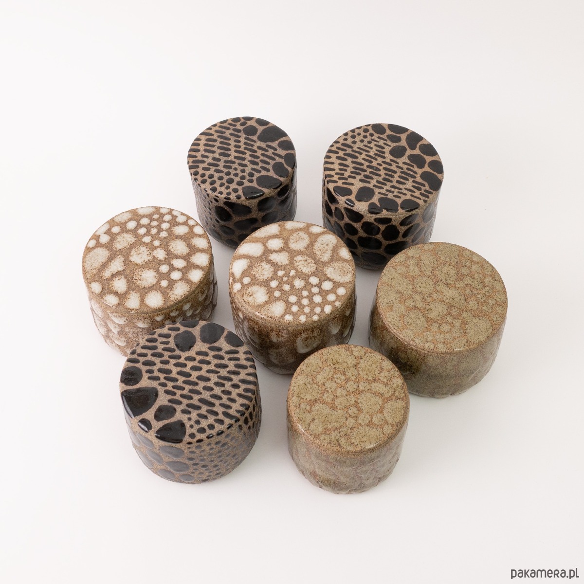 Kolory: naturalnie brązowy kolor gliny z jaśniejszymi ciemniejszymi drobinkami (bez szkliwa / mat) + transparent + czarny (szkliwo błyszczące).