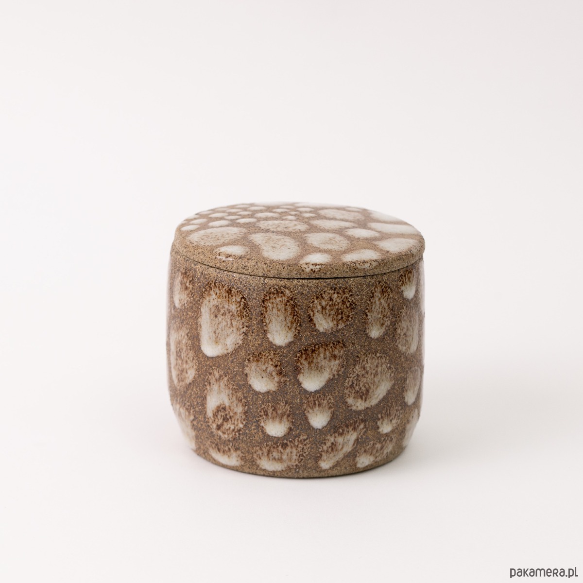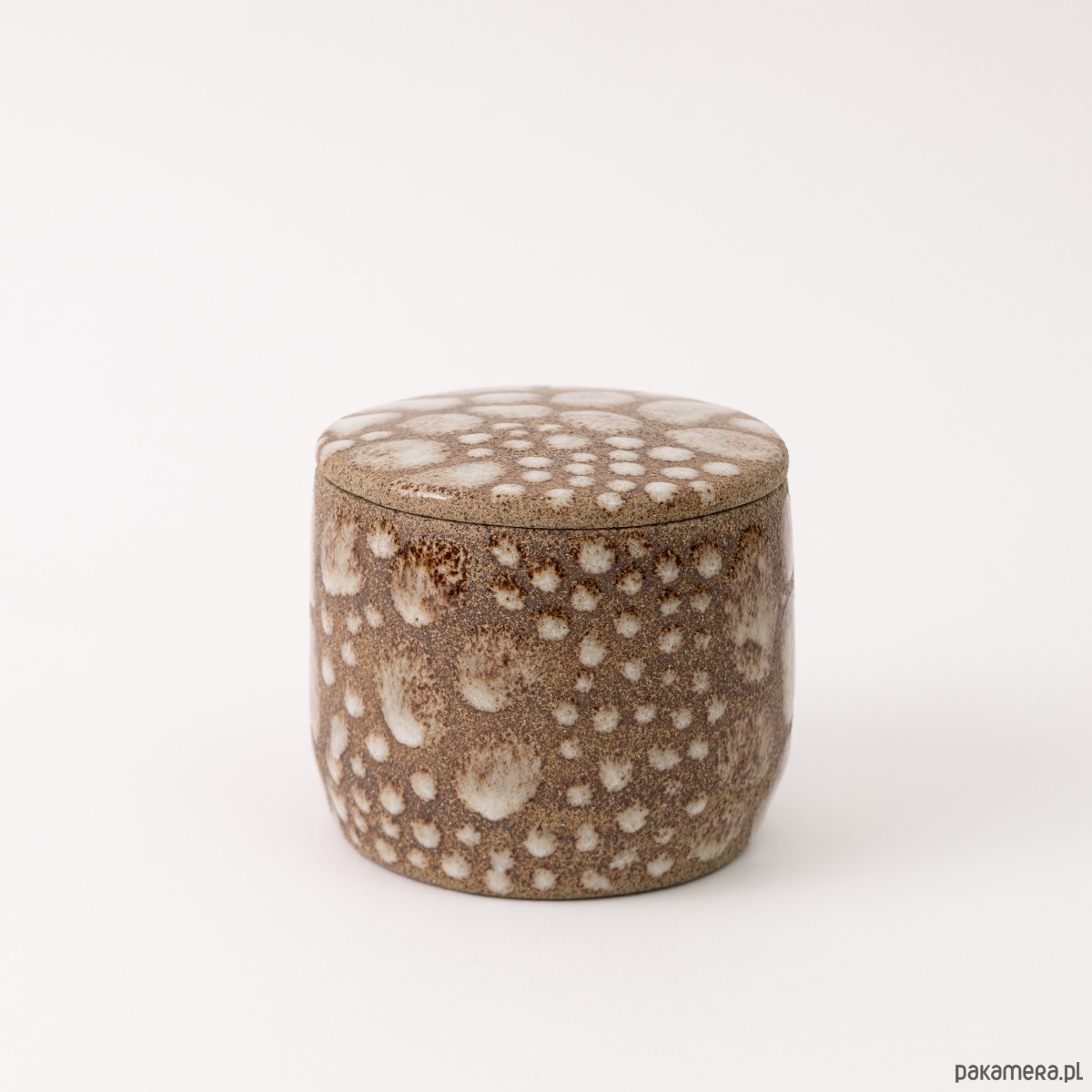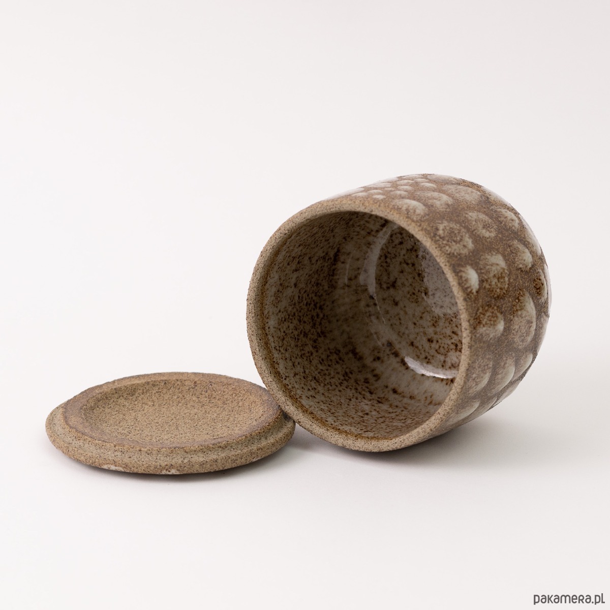 Pojemnik z pokrywką kamionki fragmentarycznie poszkliwionej.