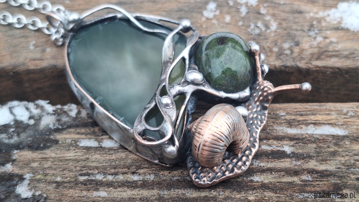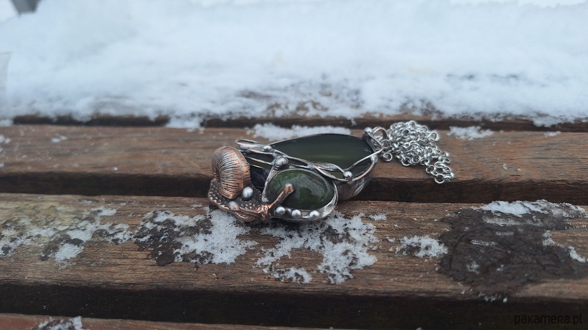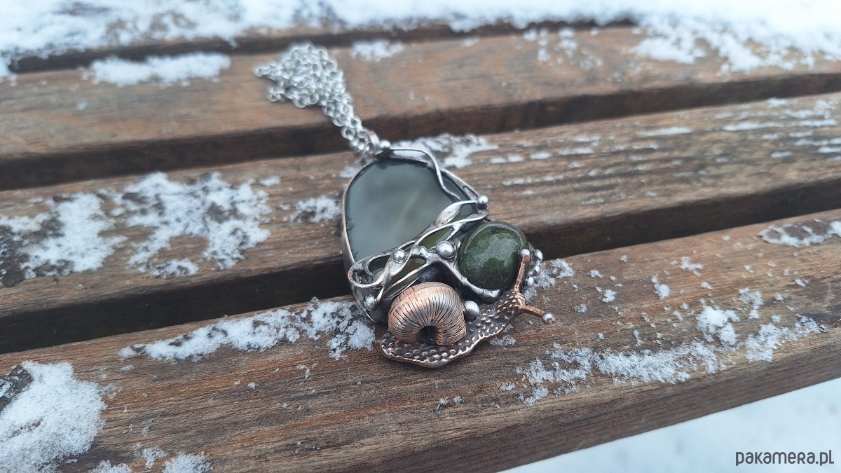 Wisiorek wykonany z miedzi, cyny, jaspisu i agatu. Wymiary ok. 6 na 4 cm. Zawieszony na łańcuszku o długości ok. 50 cm.