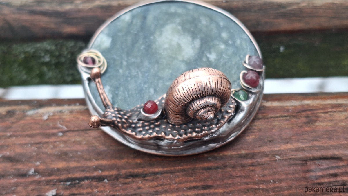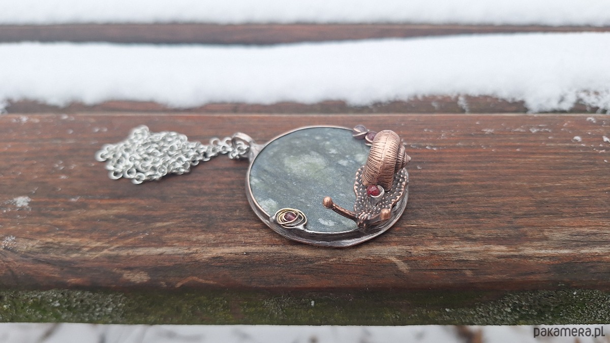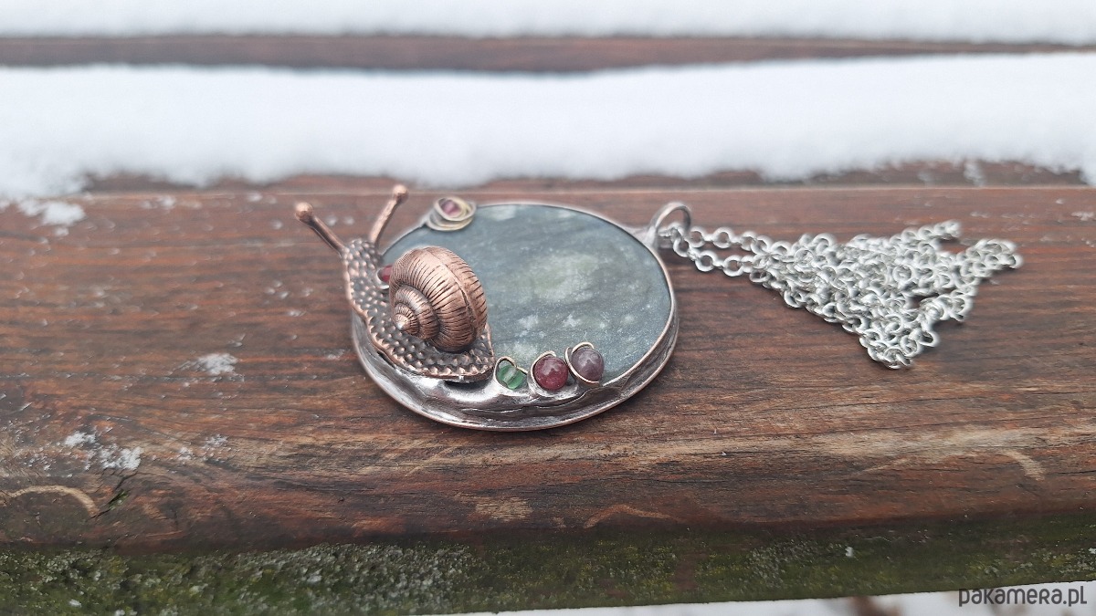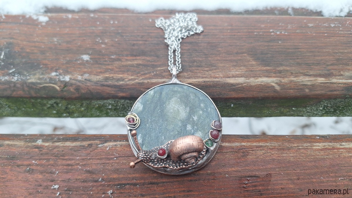 Wisiorek wykonany z miedzi, cyny, jadeitu, szkła i turmalinu Wymiary ok. 5 na 5 cm. Zawieszony na łańcuszku o długości ok. 50 cm.