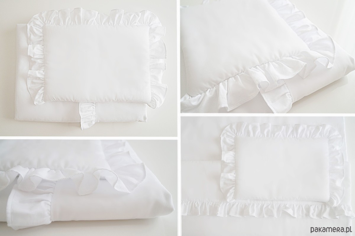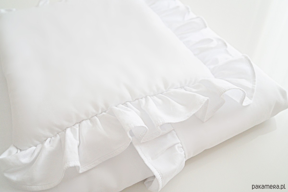 Całość prezentuje się niezwykle uroczo dzięki wykończeniu delikatną falbanką wokół podusi i na kołderce.