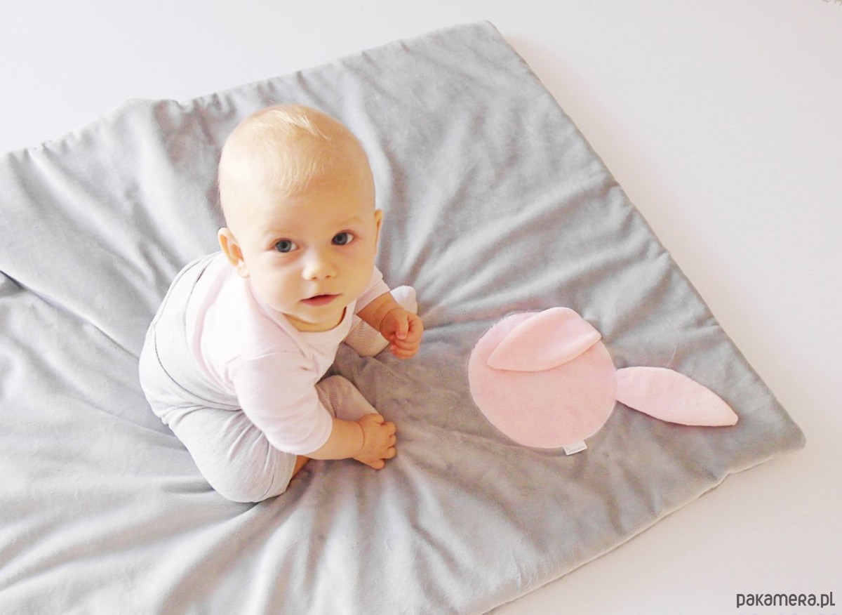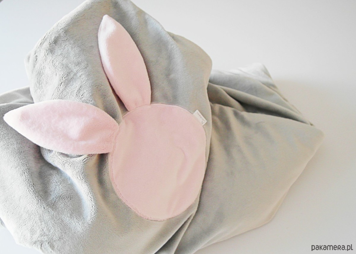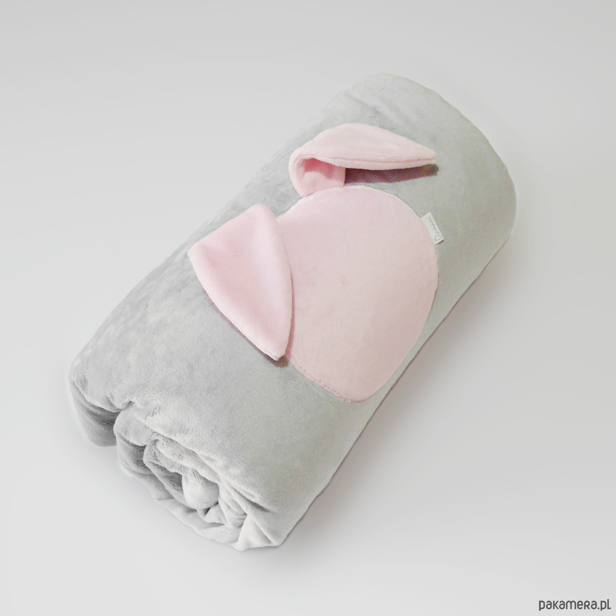 Kocyk jest niezwykle praktyczny, z jednej strony wykonany z bawełny -tą stroną okryjesz maluszka, a z drugiej strony plusz minky, dzięki któremu maluszkowi będzie niezwykle ciepło, miło i przytulnie. Uroku dodaje pluszowa aplikacja z odstającymi uszkami, które na pewno zainteresują dziecko i pobudzą je do zabawy.