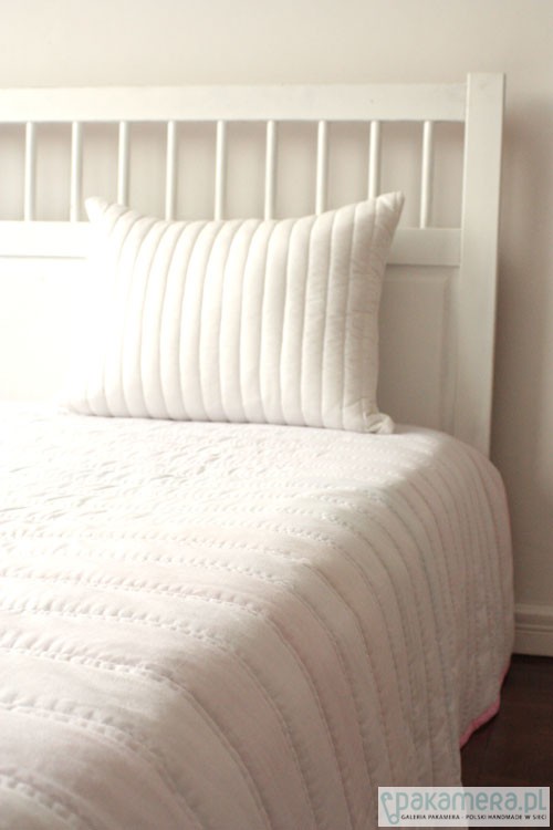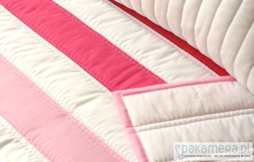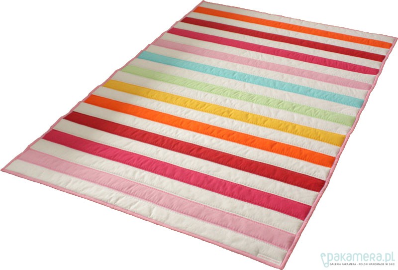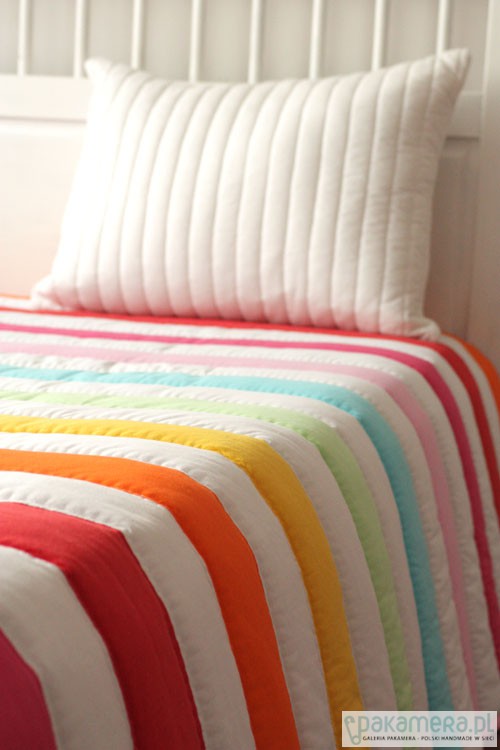 Dwustronna narzuta patchwork. Rozmiar: S 145 x 210 cm (+/-3cm).Technika wykonania: patchwork, pikowanie przez 3 warstwy. Wypełnienie z włókniny poliestrowej. Jedna strona w biało- tęczowe pasy, druga strona biała; wokół różowa lamówka. Pomarańczowy jaśniejszy niż na zdjęciu, turkusowy ciemniejszy. Tkaniny: bawełna 100%. Prać ręcznie lub w pralce (program dla tkanin delikatnych) w 30st. C