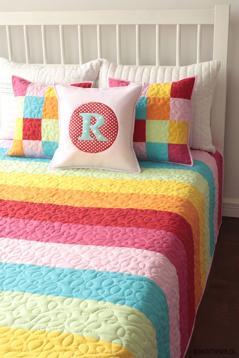 Dwustronna narzuta patchwork. Różne rozmiary do wyboru. Tolerancja wymiarów +/-3cm. Technika wykonania: patchwork, pikowanie przez 3 warstwy Wypełnienie z włókniny poliestrowej. Jedna strona w tęczowe pasy, druga strona i lamówka różowe. Tkaniny: płótn obawełna 100%. Prać ręcznie lub w pralce (program dla tkanin delikatnych) w 30st. C.