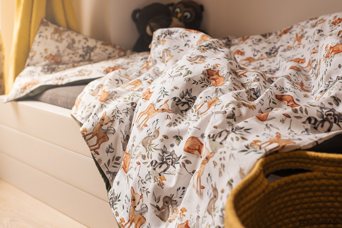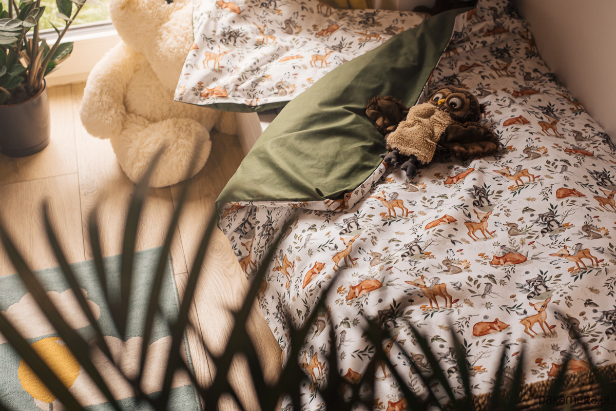 Las zawsze stanowi dla dzieci przestrzeń do poznawania nowych zwierząt i roślin. Jest nieoczywisty, ciągle pełen tajemnic, ale jednocześnie przyjazny i pełen piękna. Taka też jest zaprojektowana przez polskiego projektanta nasza pościel o wzorze "leśna przygoda".