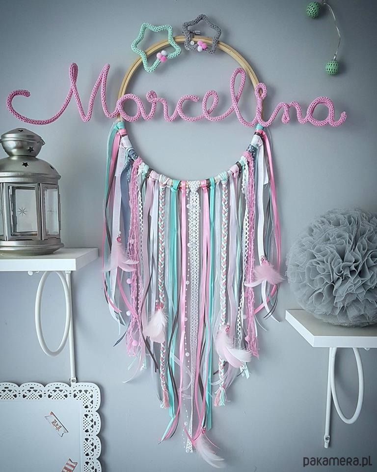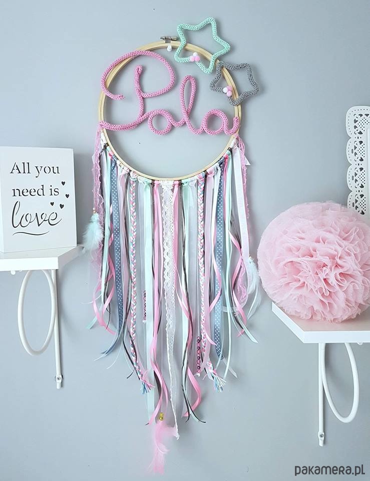 Łapacz snów z imieniem wraz z kolorowymi tasiemkami symbolizuje zatrzymanie tylko tych najpiękniejszych snów i chwil Malucha.