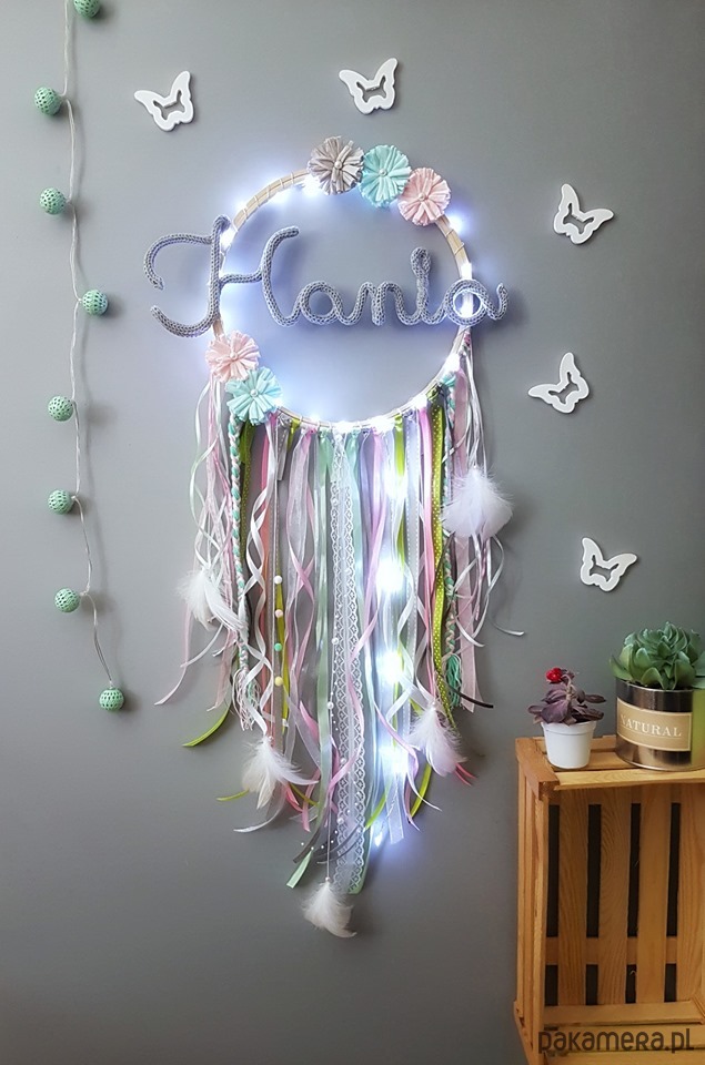 Świecący łapacz snów z imieniem dziecka. Pięknie oświetli każde wnętrze.
