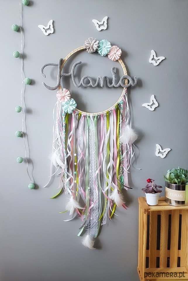 Łapacz snów z imieniem wraz z kolorowymi tasiemkami symbolizuje zatrzymanie tylko tych najpiękniejszych snów i chwil Malucha.