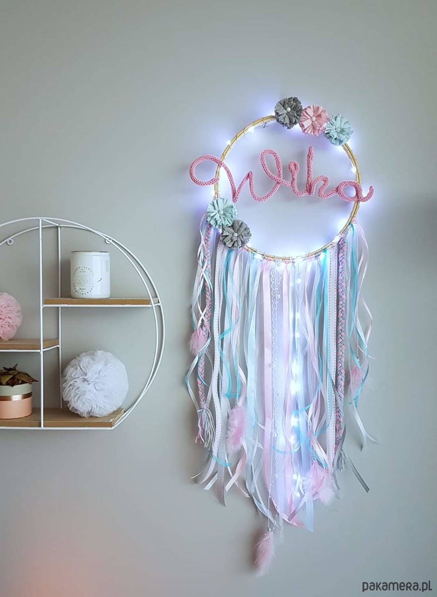 Świecący łapacz snów z imieniem dziecka. Pięknie oświetli każde wnętrze.