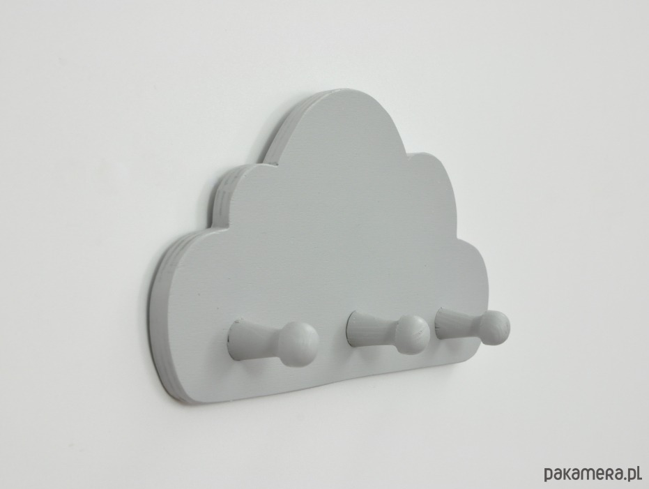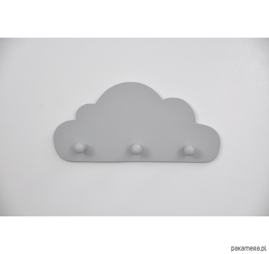 Drewniany wieszaczek w kształcie chmurki został pomalowany na szaro. wymiary: długość 29,5 cm, wysokość 14 cm.
