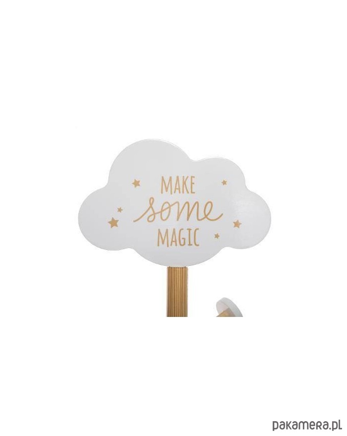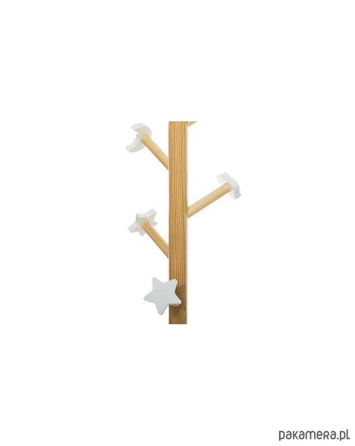 Stojący, biały wieszak na ubrania do dziecięcego pokoju. Wykonany z MDFu, na okrągłej podstawie, z kołeczkami z gwiazdkami na odzież, zakończony chmurką.