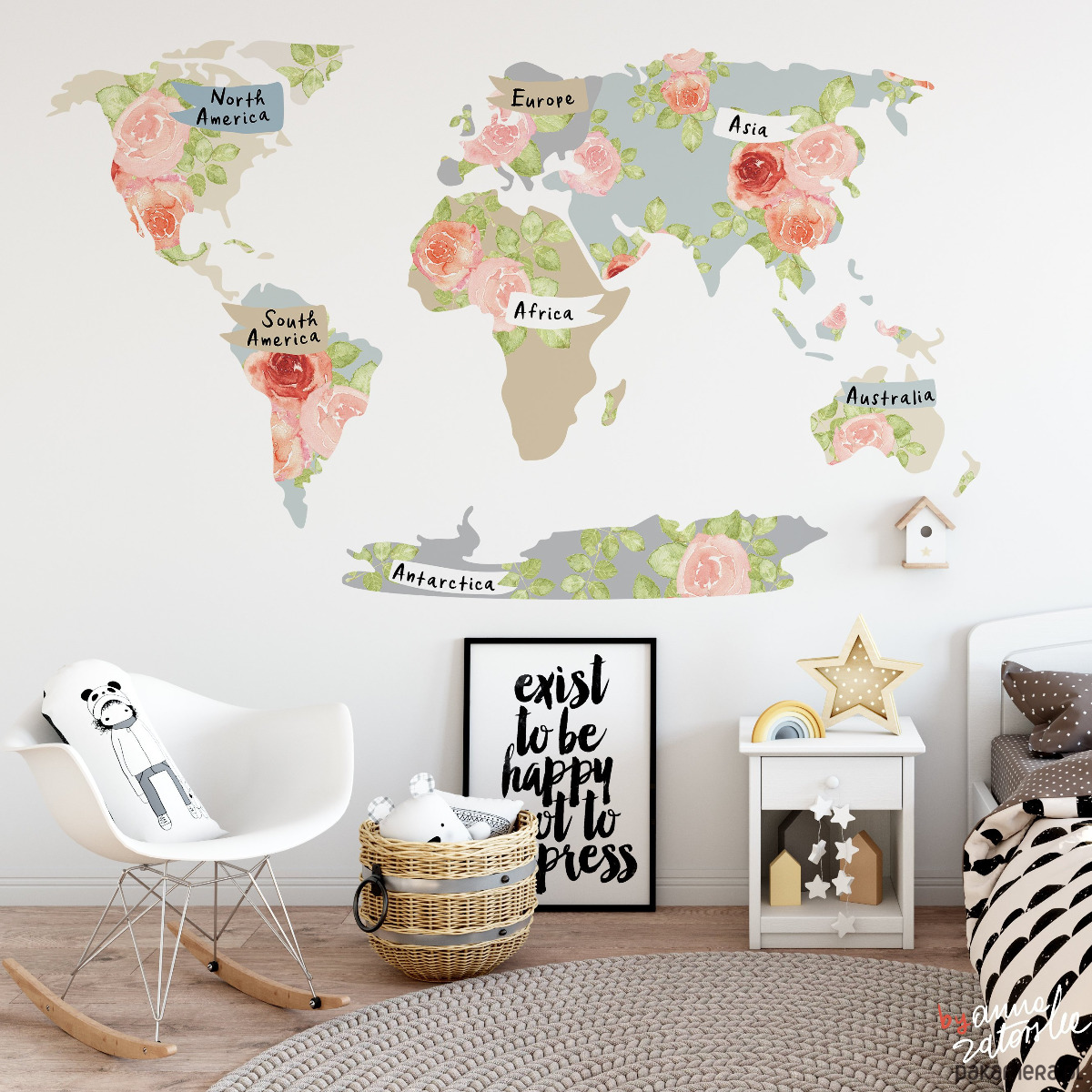 Mapa świata w stylu retro! w tle są ręcznie malowane róże w stylu vintage. Na kontynentach są ich zwierzęcy mieszkańcy i nazwy. Zwierzęta i drzewa, które możesz naklejać dowolnie w zależności od preferencji (UWAGA! zwierząt nie ma na mapie, dokładasz je samodzielnie)! Dlatego Ta naklejka jest nie tylko dekoracyjna, ale także uczy!