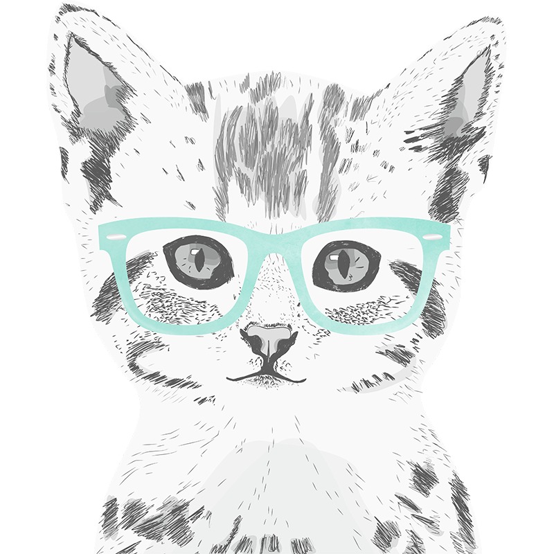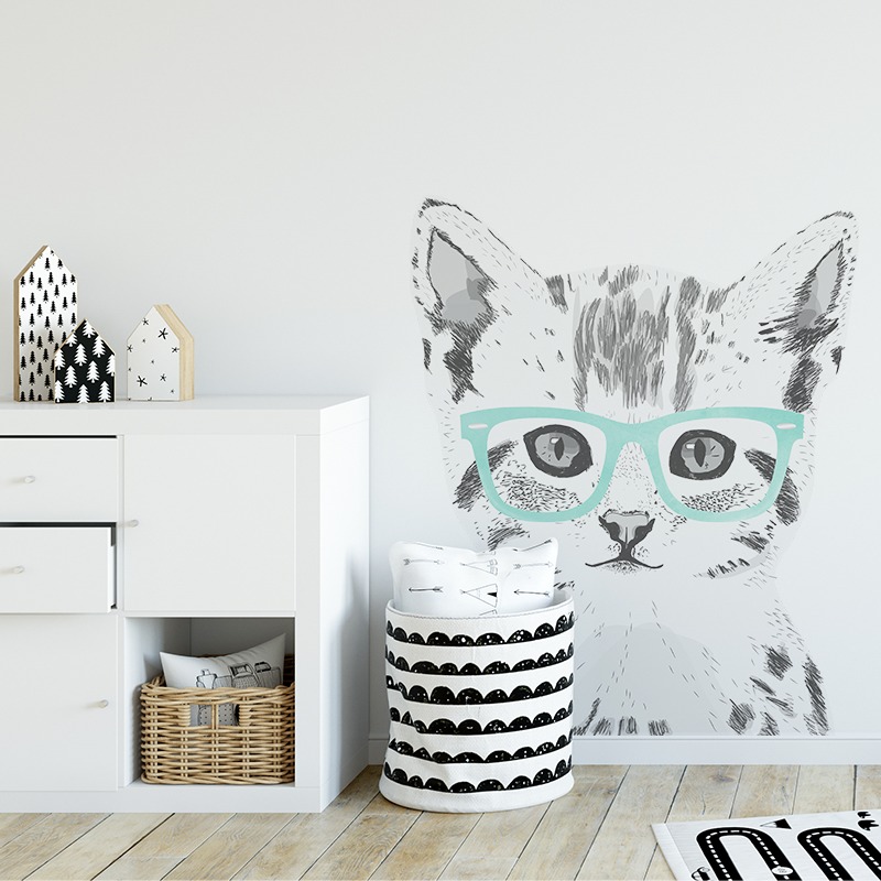 Naklejka na ścianę wycinana z folii drukowanej. Naklejka z motywem kota w okularach. Do wyboru trzy kolory okularów.